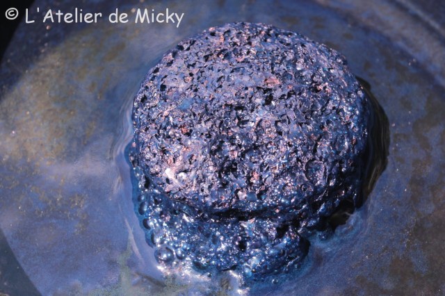 Une fois la réaction de réduction faite, vous verrez c’est assez rapide, la cuve devient verdâtre et une pellicule irisée se forme en surface, vous pouvez compléter votre cuve finale avec votre cuve-mère et bien homogénéiser. Comme toujours avec l’indigo, un mouvement de rotation rapide avec un bâton est préconisé, de façon à créer dans votre cuve un vortex, mais sans faire trop de bulles! Vous aurez une belle boule de mousse bien bleue au centre de votre cuve. C’est bon signe!
