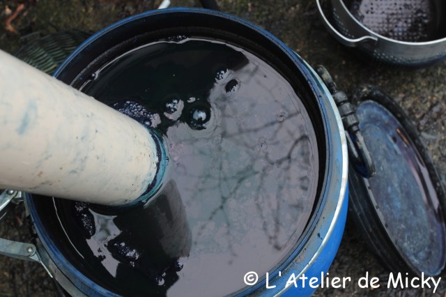 One important detail about this vat: your fibers should never touch the sediment at the bottom! You will get stains hard to get rid of and your dye won’t be even. You have to let the vat settle a while, at least 10 minutes, then use a basket or some contraption that separates the sediment from the bath. If your vat is deep and narrow enough, you can dye close to the surface without moving too much for small pieces. As a vat, I happily use these agricultural containers used for storage that are narrow and a have a lid that can be tightly closed for transport.