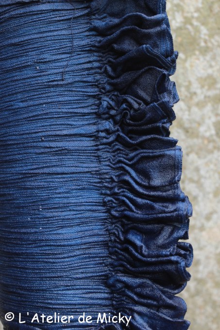 Comme je ne suis toujours pas très douée pour faire des nœuds bien serrés, j’avais des plis qui n’étaient pas assez solidement rapprochés. Je n’ai donc pas osé triturer ma pièce trop intensément dans les bains, je n’ai pas une très bonne pénétration de l’indigo entre les coutures du coup, le résultat n’est pas assez net à mon gout. Il va falloir que je m’améliore sur ce point! Ce n’est pas moche, mais pas non plus à se rouler par terre à mon avis…