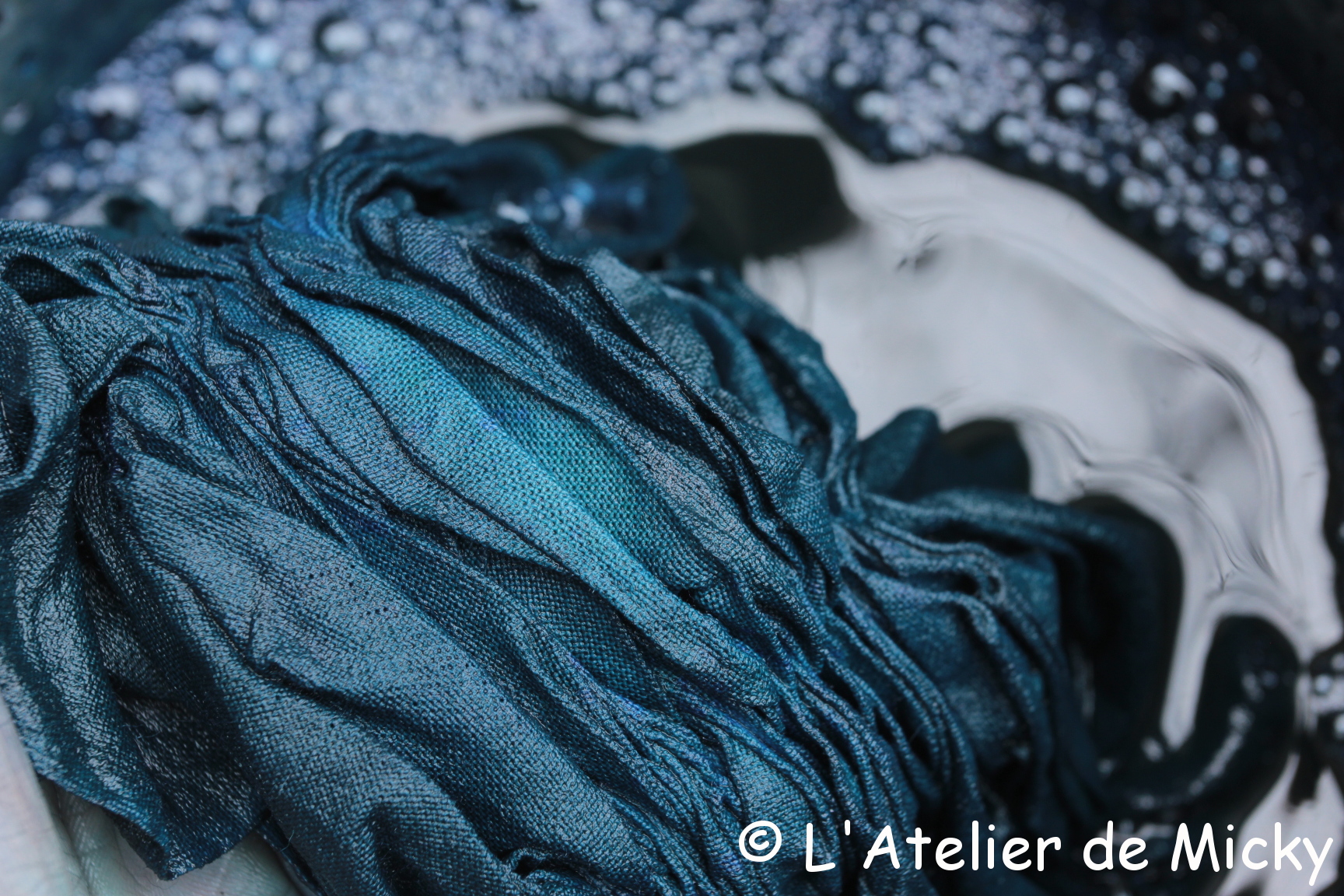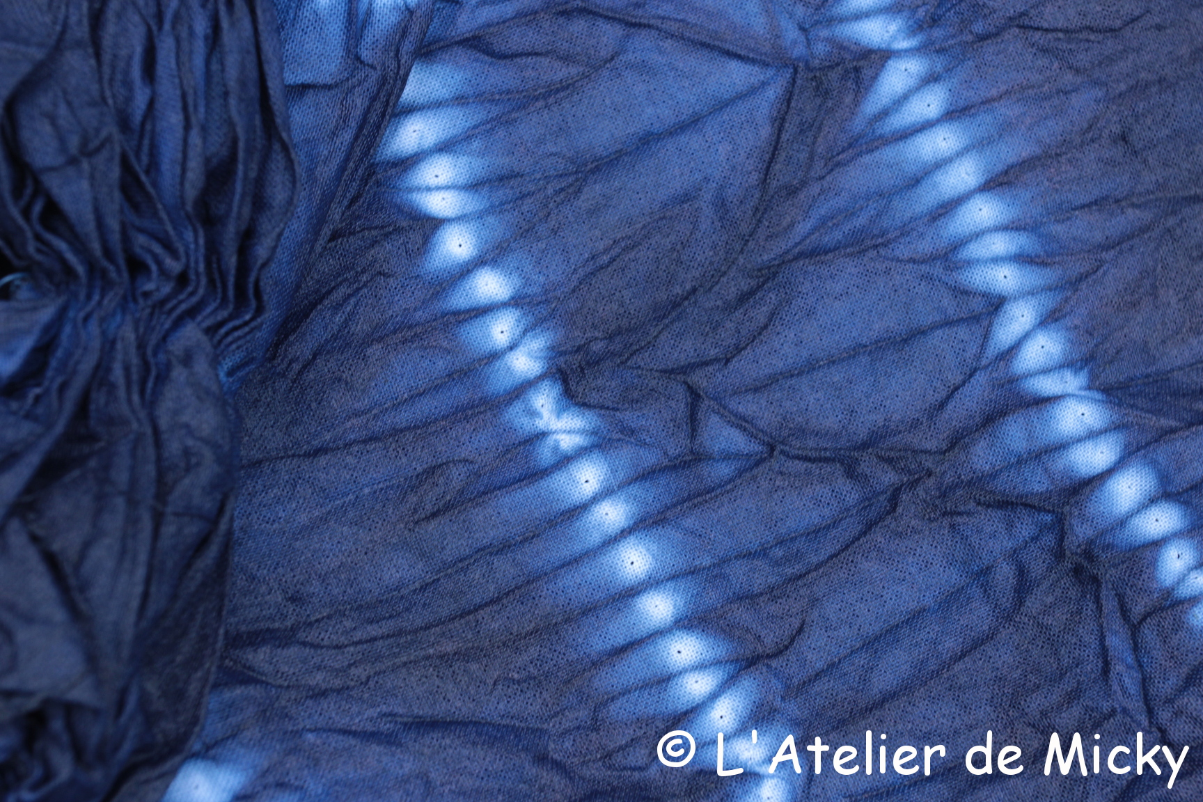Vraiment bravo pour cette teinture Shibori, très réussie en ce qu elle est assez foncée,vous employez le Sulfate de fer car c est le seul réducteur parmi bien d autres a avoir un potentiel rédox supérieur a 700mv a froid ,pour les autres il faut chauffer et plus on est chaud moins on a de forces électrostatiques entre le colorant et la cellulose, on unit mieux mais on est plus clair..Vous n etes pas une débutante visiblement,bien vu la cuve mère et surtout le Ph trop élevé,l idéal se trouvant entre Ph 10 a 10, 5 reserver une cuve unique pour les premiers rinçages vous permettrait dans le temps de recuperrer l Indigo insoluble donc précipité en fond de cuve, cette cuve peut être acide ( acétique) ou pas , les sels formés avec la chaux et récupérés en partie avec le fond d Indigo ne gèneront pas les teintures suivantes.