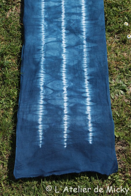 I’m still not good at making tight knots, my folds were not tight enough and so I was scared to move my piece too much in the bath… The dye penetration in between was therefore not really good, the result is not clear enough for my taste. I’ll have to work on that! It’s not ugly, but not beautiful either in my opinion…