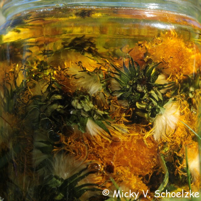 En parlant de pissenlits, j’ai profité de leur floraison pour faire une macération huileuse de fleurs qui me servira à faire un baume.