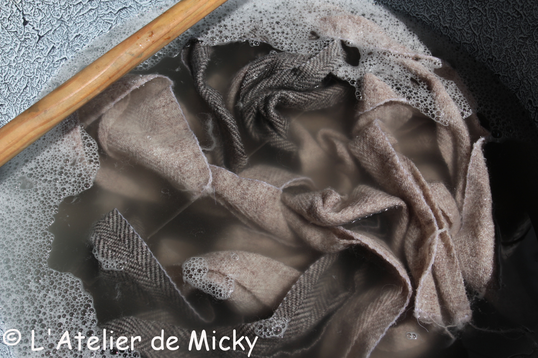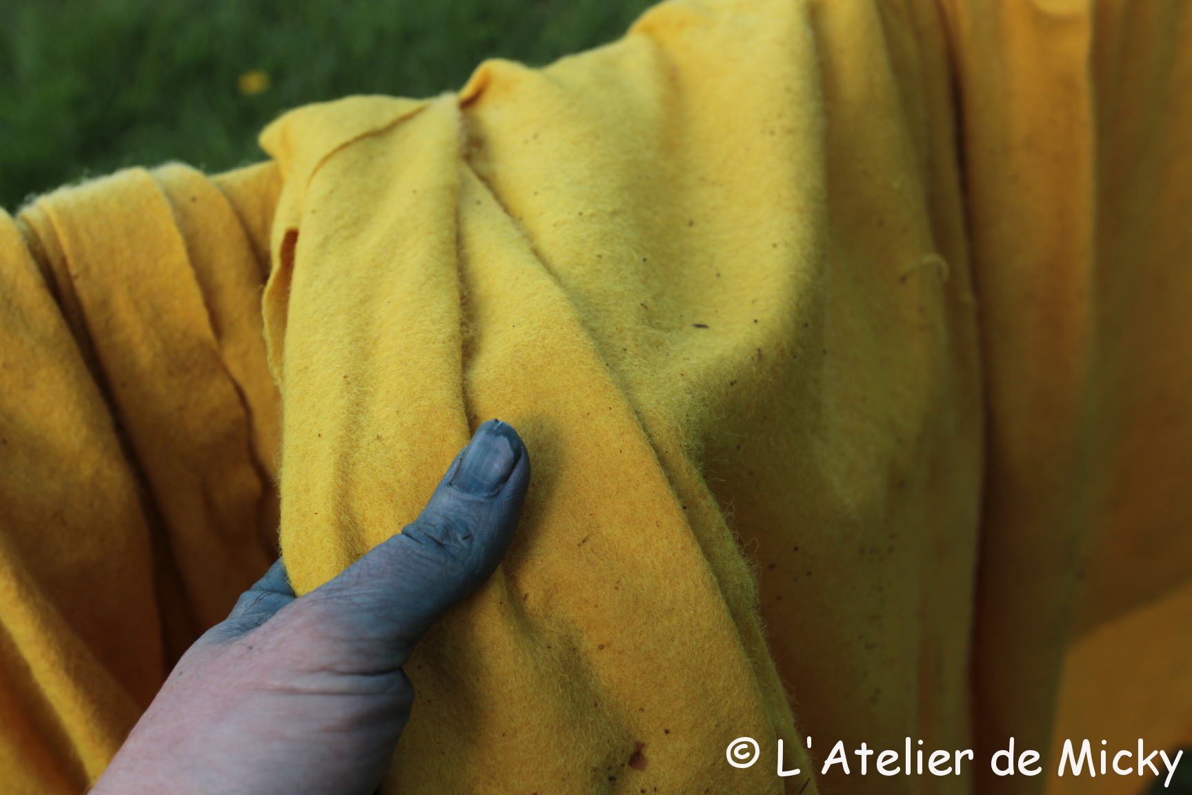 Voici quelques images d’une teinture de drap de laine, j’avais deux pièces à teinter dans un « jaune doré » selon les désirs des clients. J’ai utilisé de la gaude en bain assez alcalin puis il a fallu doser de la garance pour aller vers un jaune chaud sans tomber dans le orange, ce qui n’est pas évident. Pas de recette précise dans ce cas, tout se fait à l’instinct et à l’oeil, sachant qu’il n’est pas simple de juger de la couleur sur un drap de laine mouillé, on apprend avec l’habitude mais il y a toujours un petit stress et on ne sait jamais s’il va falloir re-teinter ou pas.