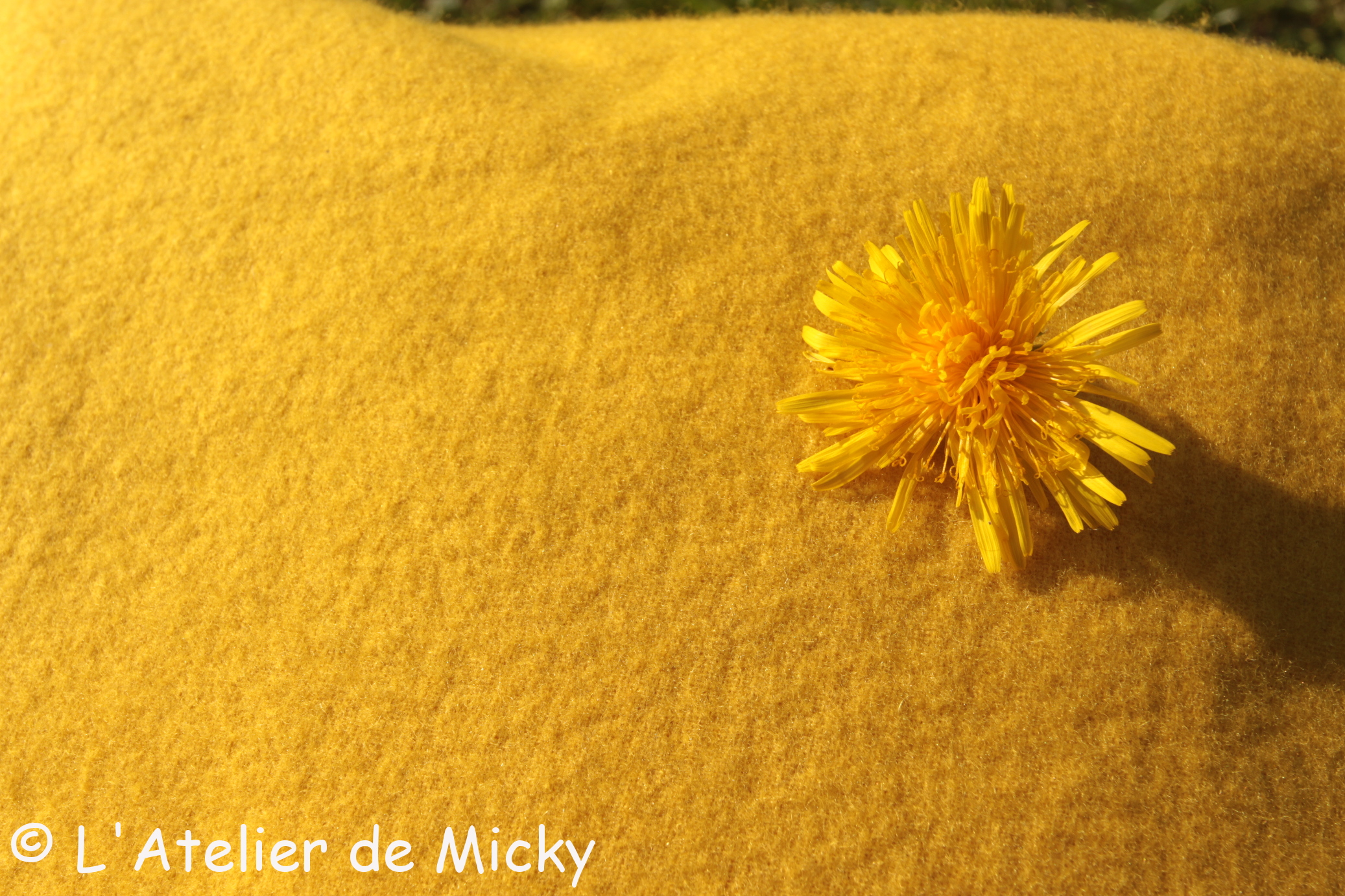 Comme c’est difficile de prendre en photo certaines teintes correctement pour que les clients puissent juger si la couleur leur va ou pas, j’essaie de trouver des références connues, ça peut être un billet de banque ou autre chose. Là, j’avais la référence parfaite sous la main, avec les fleurs de pissenlit qui fleurissaient partout!