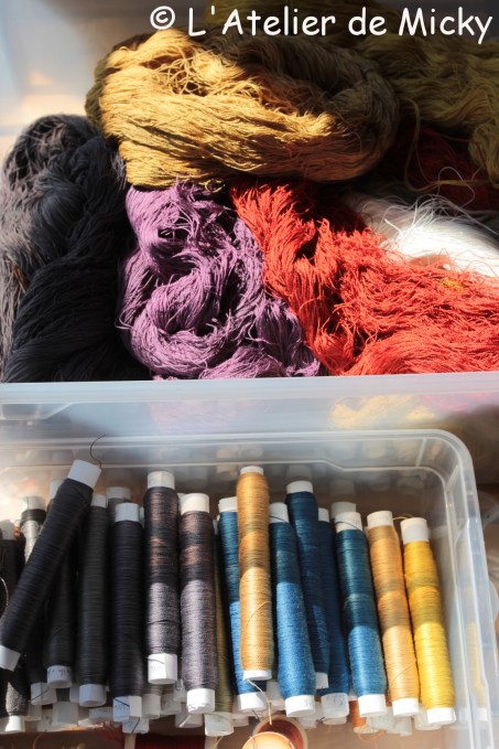 Il me manque encore certaines couleurs, mais il y a déjà les « classiques »: rouge garance, dorés bourdaine, gris galles+fer, orange gaude+garance et un improbable marron glacé obtenu « pour voir » dans une cuve épuisée et vieille de 10 jours de bois de campêche (tenue à la lumière en cours de test!)