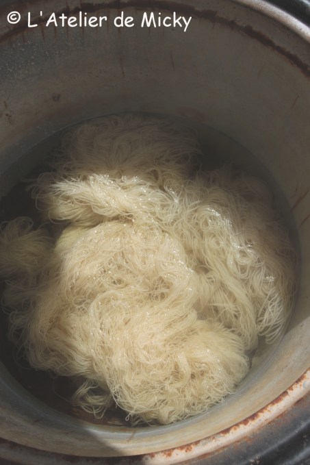 On the silk side, I have several types of silk that I dye regularly, therefore I have to check every type carefully to see what needs to be dyed again. I have some stock for fine silk that needs to be wound onto bobbins as well. I never dye my silks with big pots of wool, which would save me a lot of time but at the expense of quality… The silk skeins don’t behave the same way as wool skeins and I often use different dye procedures for them, they get their little individual dyebaths!