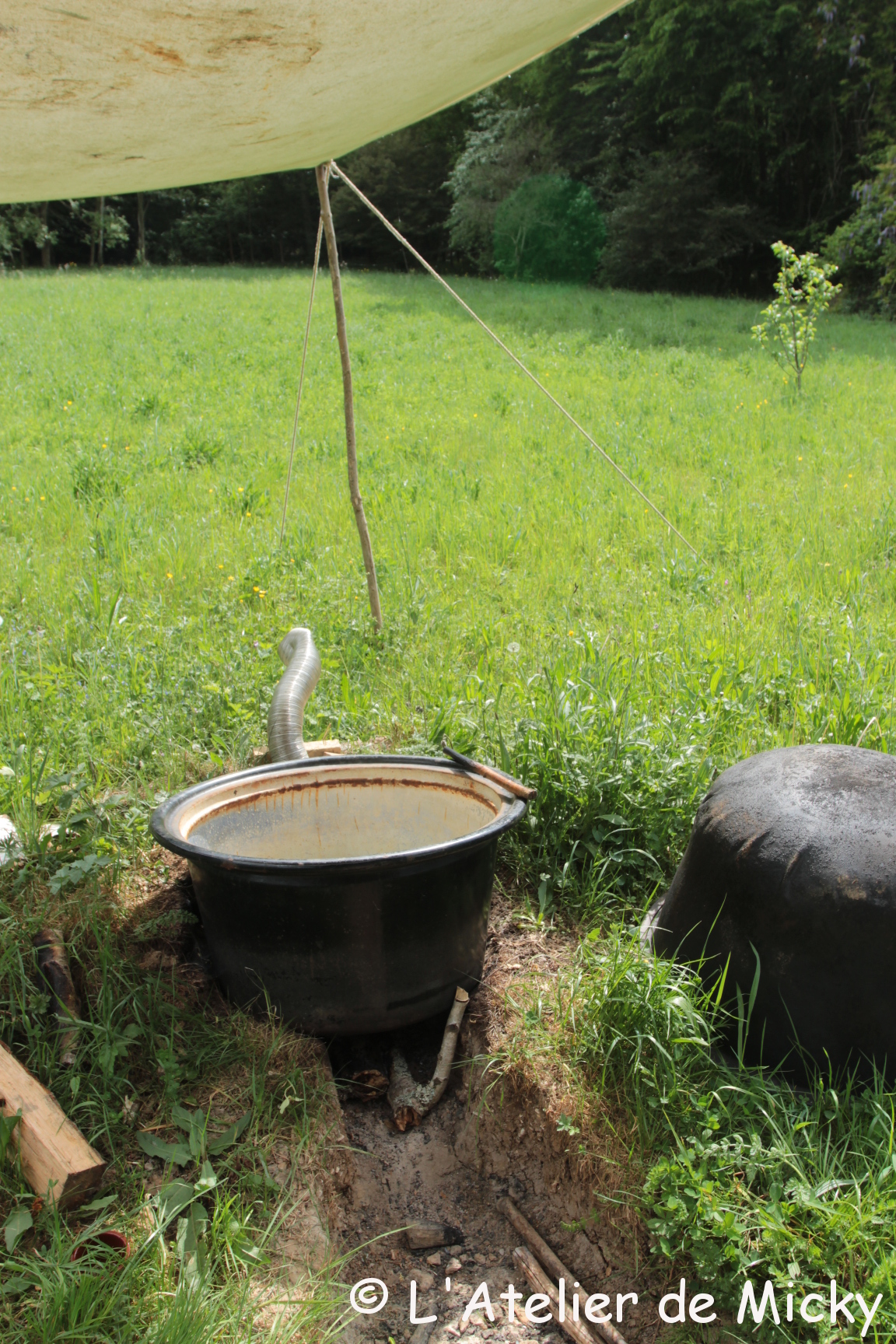 Pour faire mes mordançages à base de fer, j’ai sorti un chaudron qu’on m’a offert et qui a bien vécu. C’est un chaudron en émail dont certaines parties ont sauté et donc il y a eu corrosion. L’émail est un verre qui recouvre du métal (acier ou fer) et qui le protège de la corrosion, donc si l’émail est abîmé, le métal en-dessous va rouiller et relarguer du fer dans la cuve (c’est pourquoi certaines teintures ne peuvent se faire dans une cuve en fonte). Une cuve en émail rouillée ne devrait plus être utilisée pour des teintures sensibles au nuançage par le fer, qui va « éteindre » les couleurs. Par contre si on mordance ou on teinte avec ajout de fer, pas de soucis!