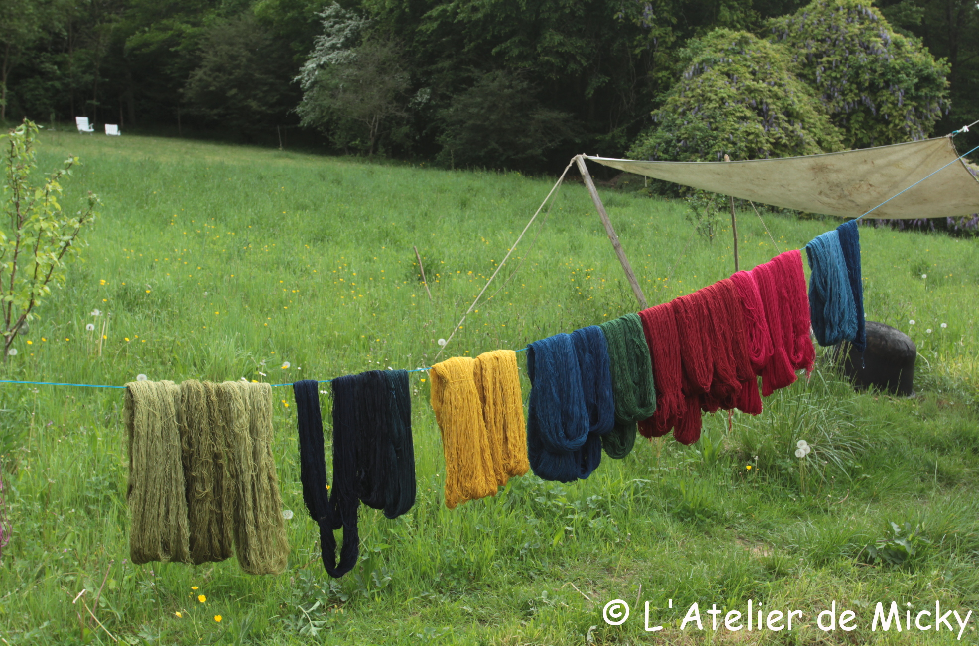 Some colors are still to be dyed but the « classics » are already done: madder red, buckthorn alder bark golds, gall+iron grey, weld+madder orange and a surprising brown from an exhausted and old logwood bath (still have to test the light fastness on that one!).