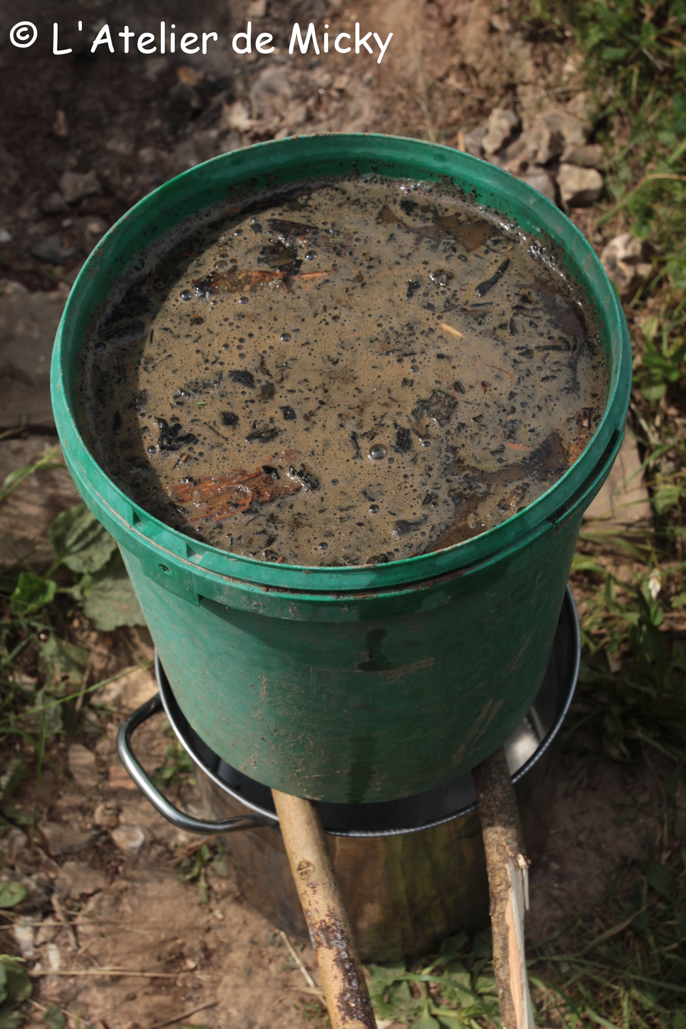 Je fais beaucoup de mes cuves en fermentation en utilisant de la potasse comme alcalinisant. Ayant une cheminée, je me retrouve toujours avec des seaux entiers de cendres de bois durs (chêne, hêtre) et je prépare en ce moment des litres d’eau de cendre, selon une technique simple et efficace: un seau percé de petits trous avec au fiond une couche de graviers suivie d’une couche de paille. Il suffit de mettre la cendre par-dessus et d’ajouter de l’eau de pluie. L’eau de cendre s’écoule doucement par les couches et les petits trous. On peut la concentrer en faisant comme pour une sauce: on chauffe pour faire réduire! Des bois différents ne donnent pas la même alcalinité à l’eau de cendre, je devrais faire des expériences pour trouver le bon bois, mais pour le moment, j’utilise ce que j’ai sous la main.