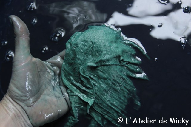 En 2017, j’avais préparé une cuve en fermentation de 120l et je viens d’avoir l’occasion de la réactiver en la chauffant à 28-30°C et en la nourrissant d’indigo, de garance et de son. Cela fait plus d’un an que je n’y ai pas touché et c’était extrêmement émouvant de voir qu’elle était encore « vivante ». En 2019, j’avais eu tellement d’événements que je n’ai pas eu le temps de continuer mes essais en grand volume, voilà qui va se rattraper en 2020… Le trempage d’un échantillon, étape essentielle avant toute teinture à l’indigo ayant montré une bonne réduction dans la cuve, j’ai commencé à teindre des tissus. Je suis tellement heureuse de retrouver cette grosse mémère!