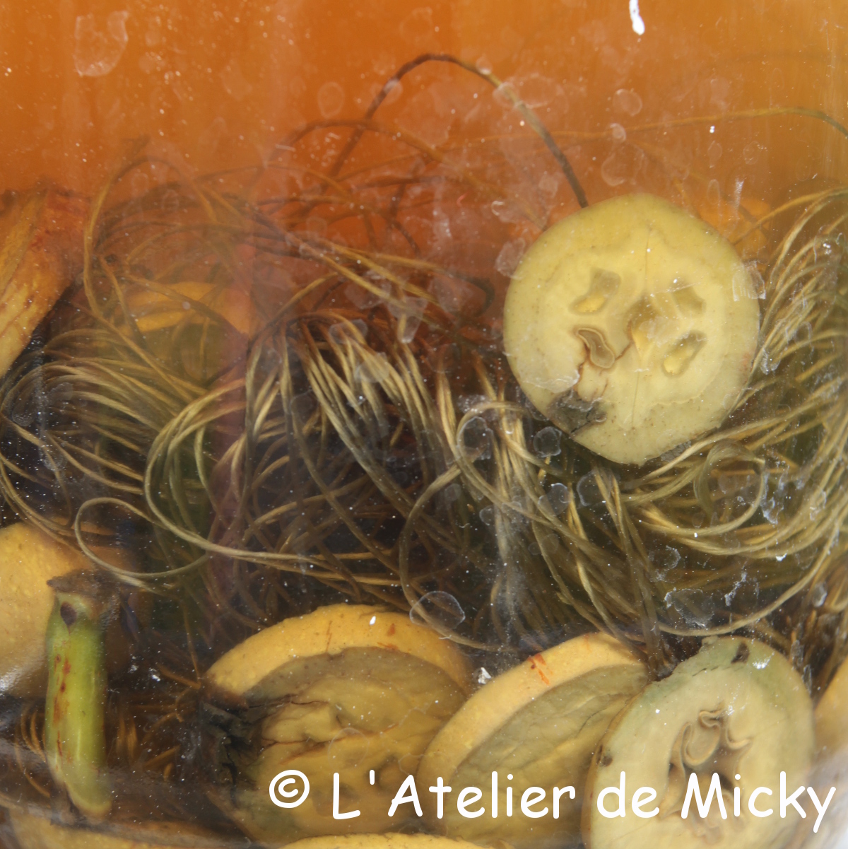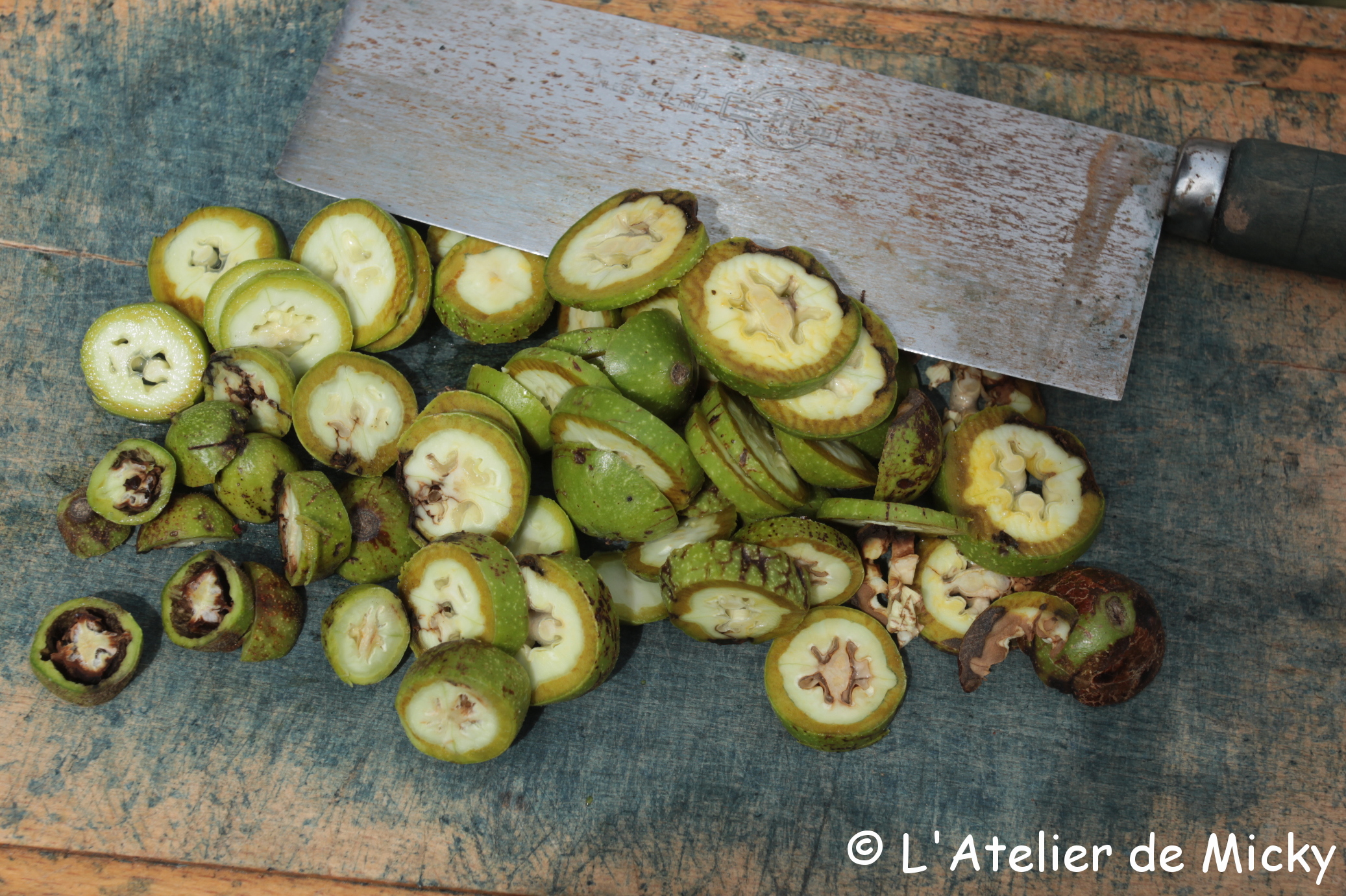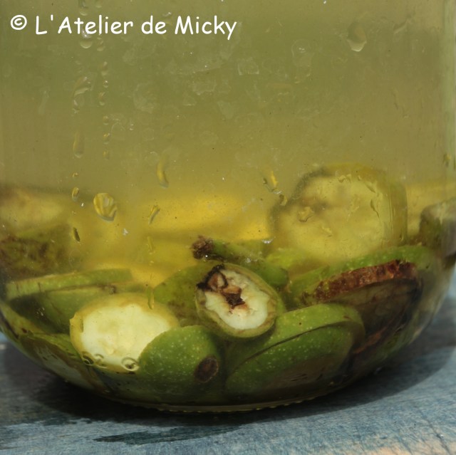 I’m very happy to notice that 2020 will be great walnut year!! After 2019 with no fruits on the walnut trees around me, I will go berserk on husks in late summer! During a stroll, I picked up some green walnuts that had been blown down by the wind. You can make a walnut « wine » with it, but you can also just put them in rainwater to dye, for example, some flat silk.