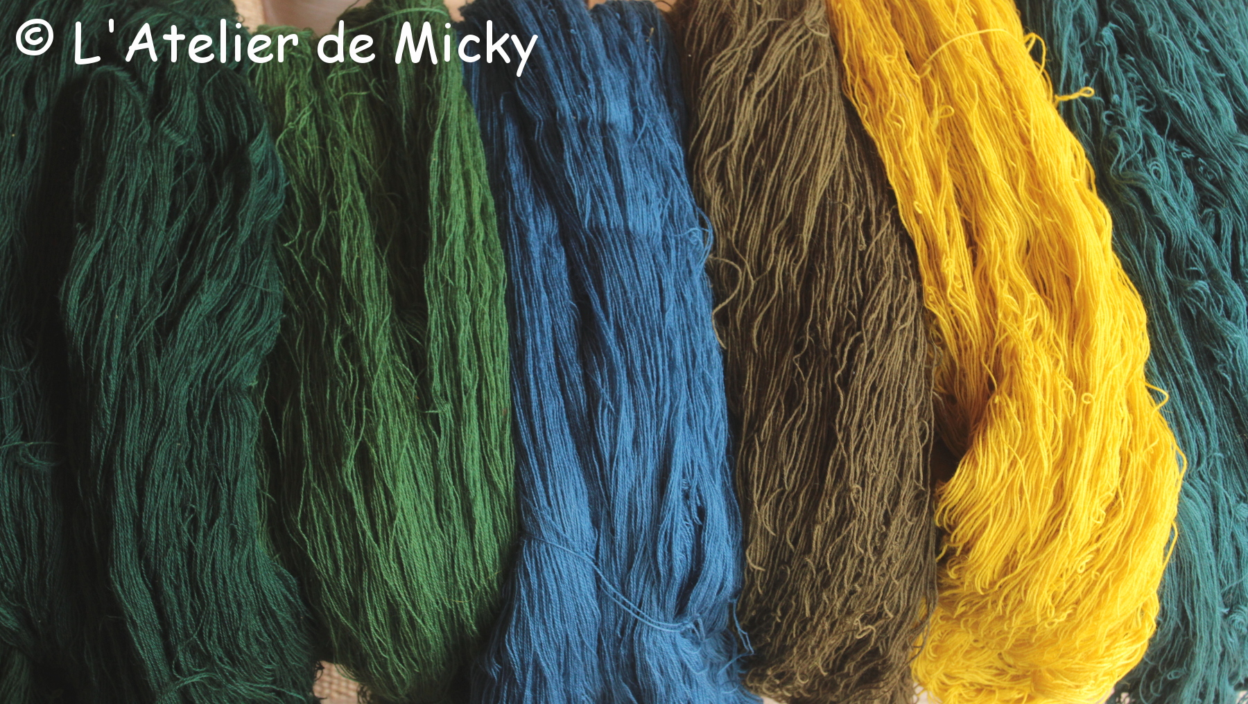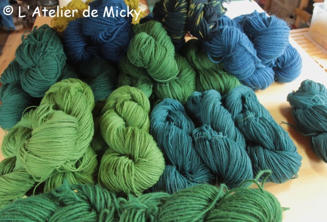 Once dry, the skeins land on my workshop table, I love these heaps of color! The bright greens were obtained by overdyeing blue with a strong weld bath. The turquoise were dyed with the once used weld bath (more blue and less yellow on the skein!). I also dyed a few khaki greens (weld + iron), but I still got a few more to work on…