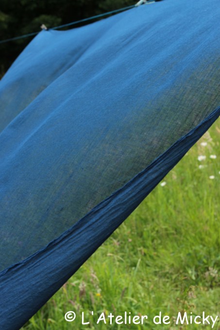 Ma grosse cuve en fermentation a accouché d’un premier tissu. Je commence petit avec un coupon de gaze de coton bio qui a séché élégamment dans le vent aujourd’hui! J’ai ré-enrichi la cuve avec de l’indigo et il ne me reste plus qu’à préparer d’autres tissus pour la teinture!