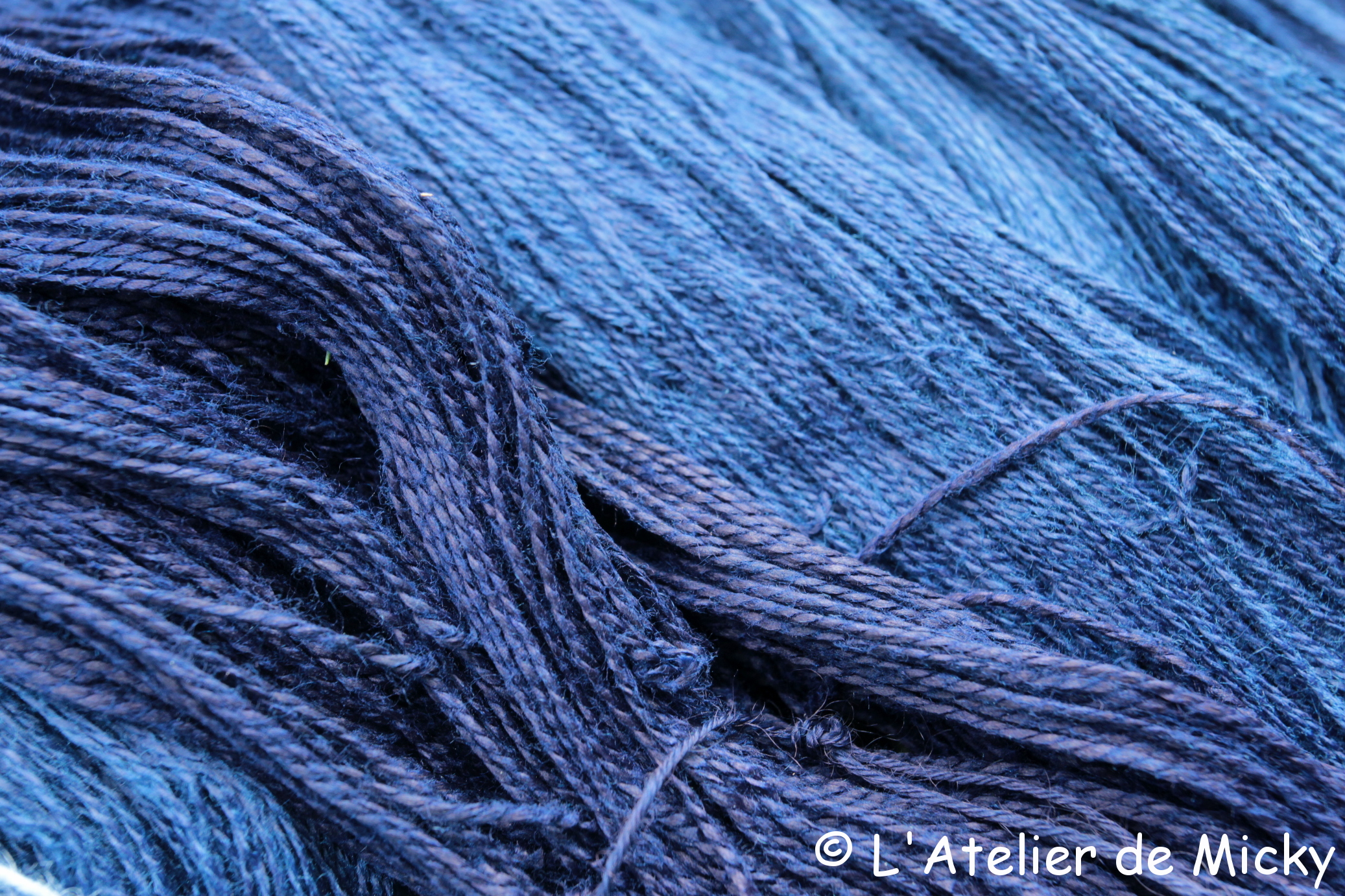 Et puis chez moi il y a toujours du bleu quelque part… je continue de teindre des soies à l’indigo, c’est long à faire car je laisse les écheveaux s’oxyder longuement entre deux bains pour une meilleure tenue de la teinture. Généralement, je fais au moins une douzaine de bains sur 2 voire 3 jours…