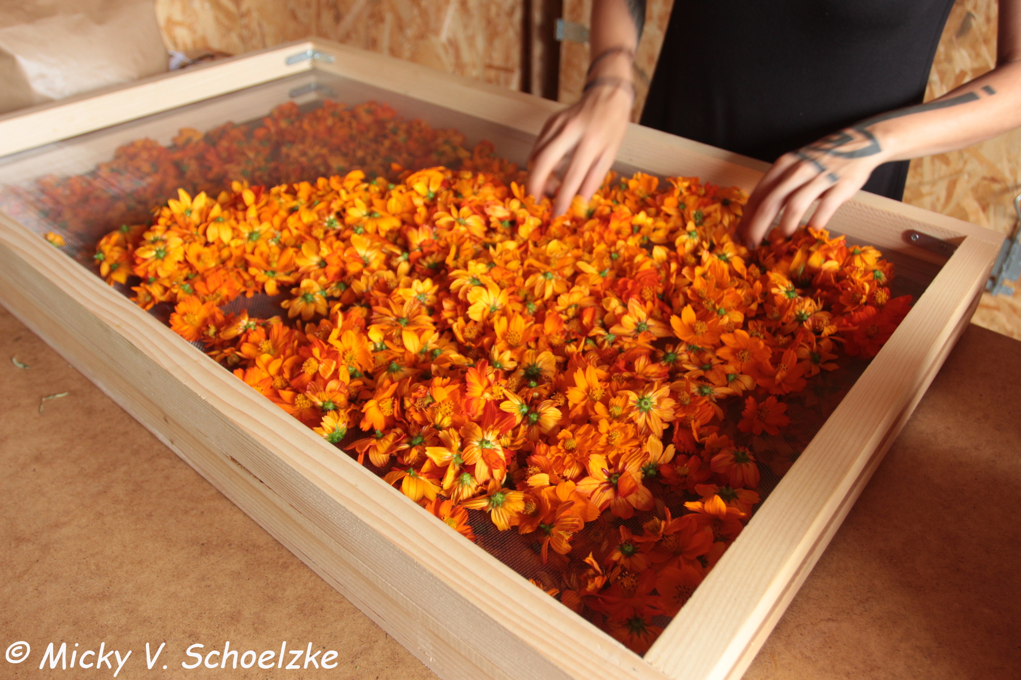 The harvested plants (dyeplants or medicinal herbs) are dried in the solar-powered dryer of the farm.
