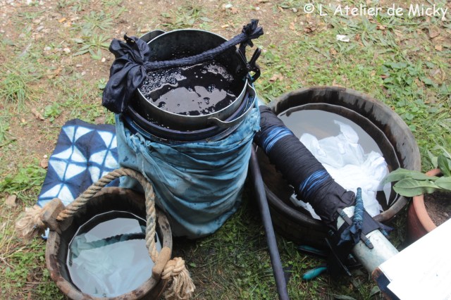 Last weekend, I was doing indigo dyeing demonstrations near my home, in Dreux. I joined the team of the association Terre d’Artistes, which offers workshops and courses in various arts and crafts (pottery, sculpture, engraving, glass, drawing, painting and more!). I will offer a one-day workshop there in January, about indigo dyeing. As I don’t have the right space at home yet to offer dyeing workshops, collaborating with an association who has the facilities is a great chance!