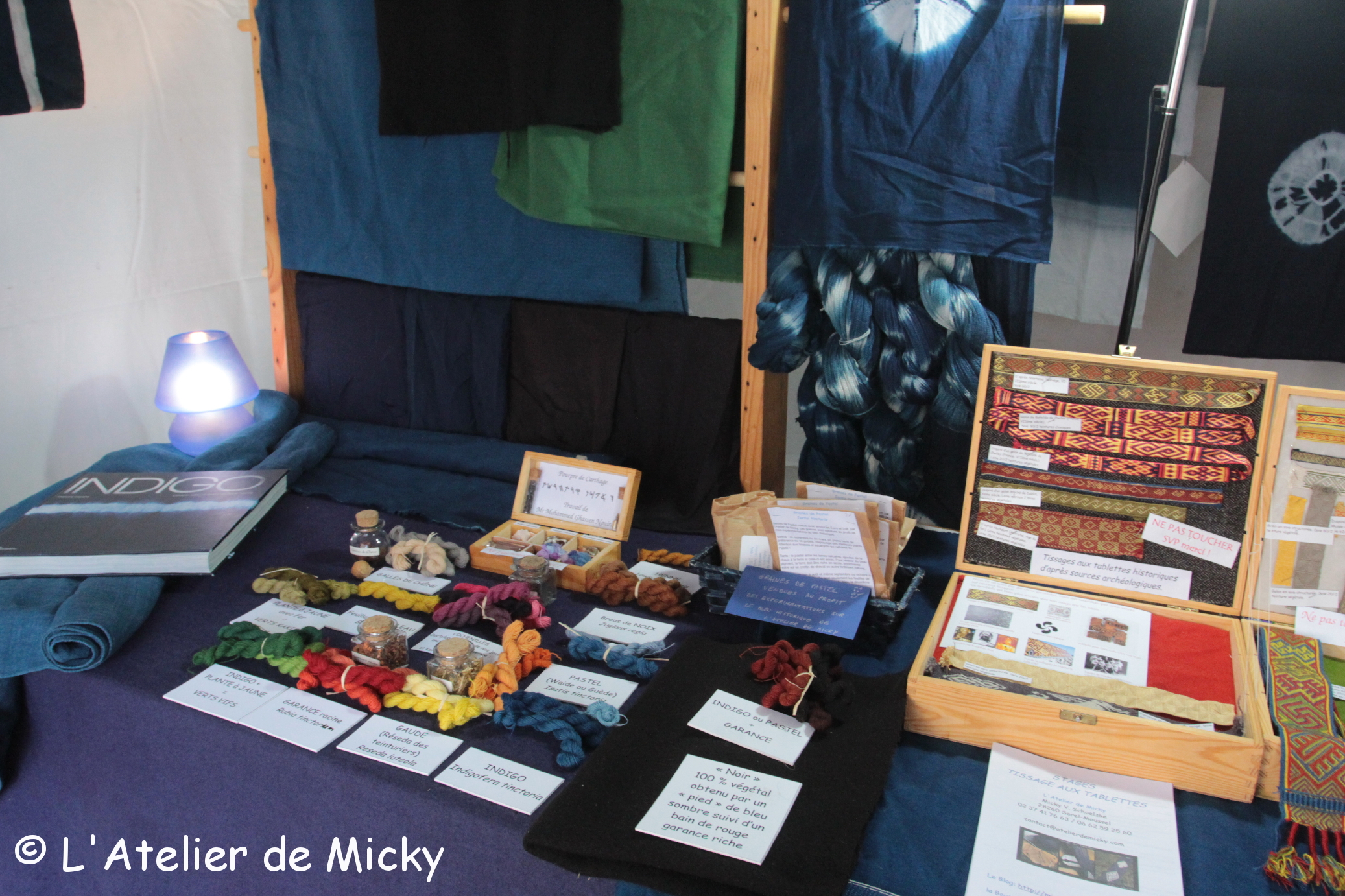 J’avais également emmené quelques tissages aux tablettes et un métier à tisser, pour montrer cette technique extraordinaire et promouvoir les stages que j’anime chez moi. Absence de stand de vente signifie légèreté logistique et liberté de décorer, j’en ai profité, sous le signe du bleu indigo évidemment!