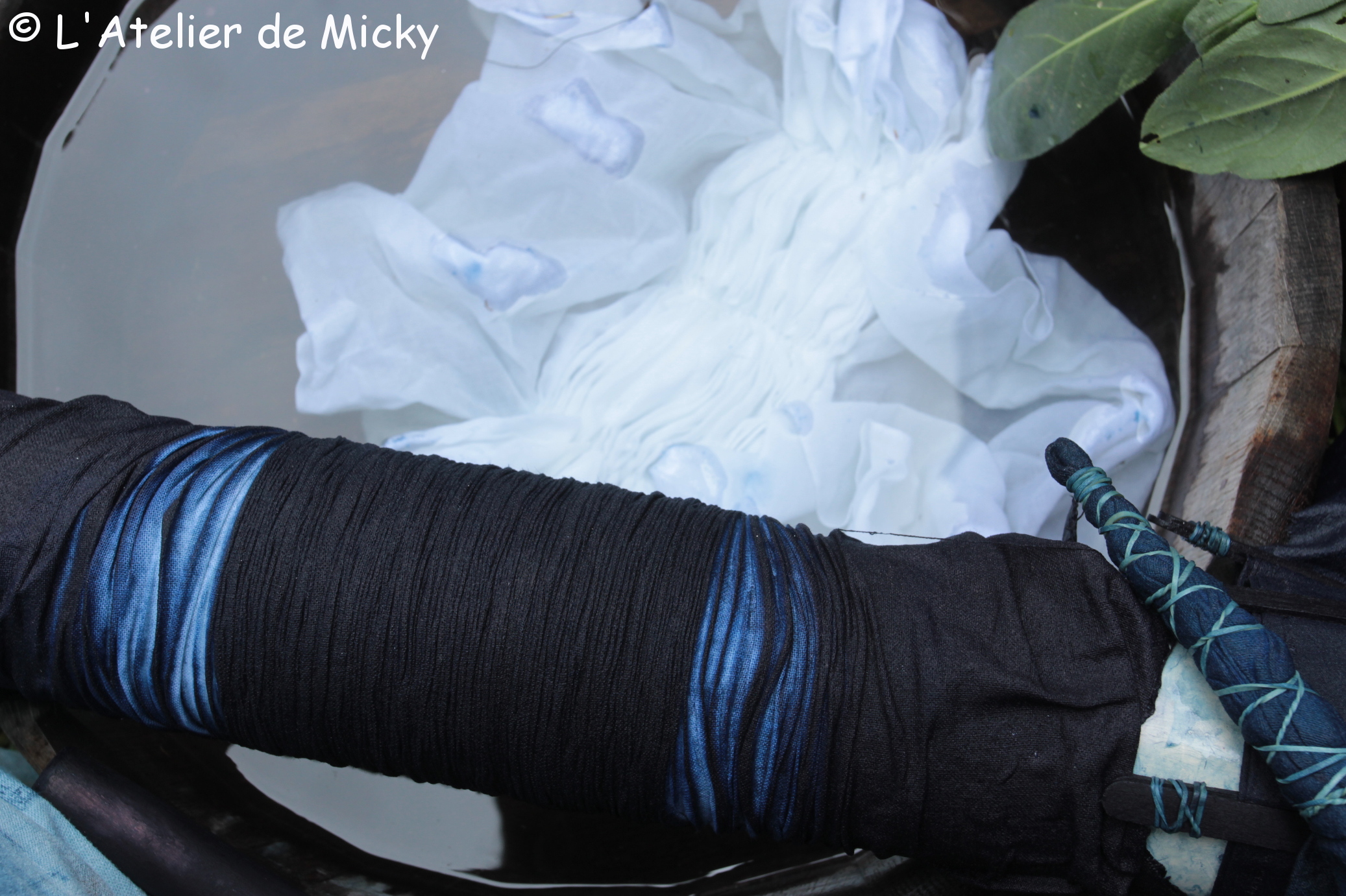 J’avais emmené une cuve d’indigo au fer (qu’on peut utiliser à froid!) et j’ai teinté des pièces de coton à la façon shibori. Pour montrer le niveau que certains artisans japonais peuvent atteindre en utilisant les techniques de shibori, j’avais sorti deux des pièces anciennes japonaise que je possède. Moi j’en suis au niveau loisirs créatifs… Et mes pliages ne sont pas très propres, car je les ai faits sur place sur mes genoux… pas eu le temps de les faire avant J’aimerais progresser dans ces techniques, mais ce n’est pas mon cœur de métier et je ne peux m’y mettre que quand j’ai un peu de temps libre, ce qui arrive relativement rarement! Apprendre et commencer à un peu maîtriser quelque chose demande beaucoup de temps et de travail…