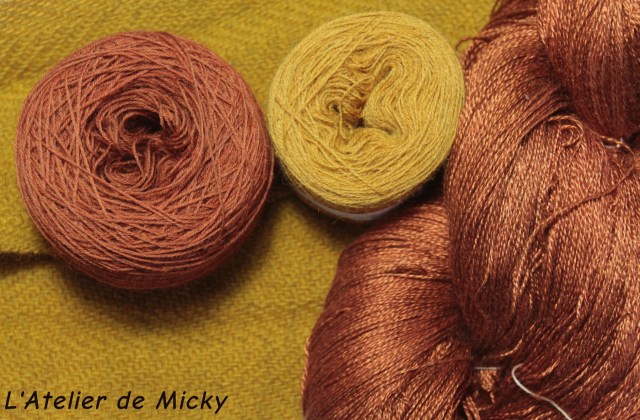 J’ai également sur-teinté quelques jaunes et rouges avec du brou de noix, même si mes cuves à froid commencent à vraiment fatiguer, il faut dire que je les ai fait travailler intensément! Ces brunitures, comme on appelle ce procédé en teinture, sont bien jolies je trouve même si elles sont très légères! J’ai complètement oublié d’en faire de plus foncées quand j’avais mes macérations bien concentrées, j’étais tellement concentrée sur mes fauves et bronzes! L’année prochaine…