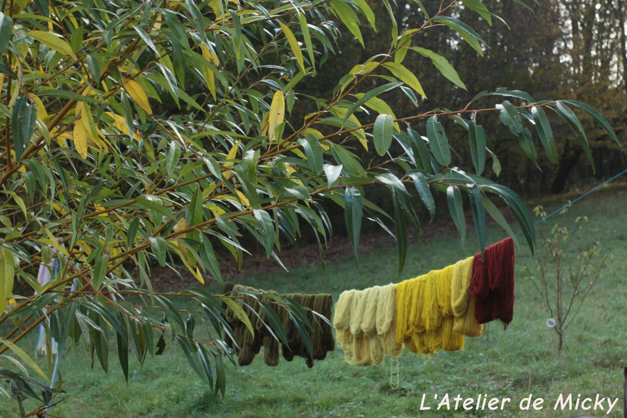 J’ai également sur-teinté quelques jaunes et rouges avec du brou de noix, même si mes cuves à froid commencent à vraiment fatiguer, il faut dire que je les ai fait travailler intensément! Ces brunitures, comme on appelle ce procédé en teinture, sont bien jolies je trouve même si elles sont très légères! J’ai complètement oublié d’en faire de plus foncées quand j’avais mes macérations bien concentrées, j’étais tellement concentrée sur mes fauves et bronzes! L’année prochaine…