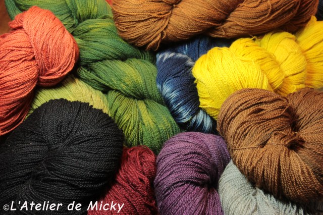 Je complète une nouvelle gamme de mérinos qui m’a manqué depuis pas mal de temps et que j’ai enfin retrouvé! Parfait pour broder et tisser aux tablettes! Mais qui dit nouvelle gamme, dit beaucoup de couleurs différentes à créer… J’en ai déjà quelques-unes, des teintes qui mettent de bonne humeur quand on les pose sur la table pour faire le point!