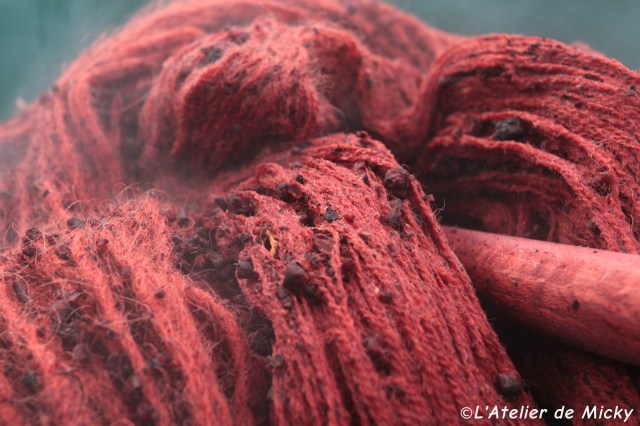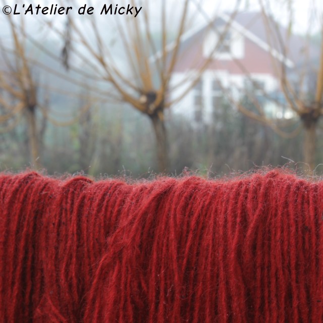Je chauffe mes cuves de garance au bois, dans mon grand chaudron, quand il ne fait pas trop froid et qu’il n’y a pas trop de vent. Mon foyer semi-enterré s’est un peu écroulé sur l’arrière et il faudrait que je répare ça pour éviter trop de déperdition de chaleur, mais je n’ai pas encore trouvé la motivation pour refaire du torchis, je déteste avoir froid aux mains! C’est bien plus agréable d’avoir les mains au chaud dans le bain de teinture! Il faudrait que je fasse le torchis pendant que je teinte je crois… Voici une belle session de garance qui a donné un rouge bien lumineux comme je les aime, de quoi illuminer une journée grise et brumeuse!