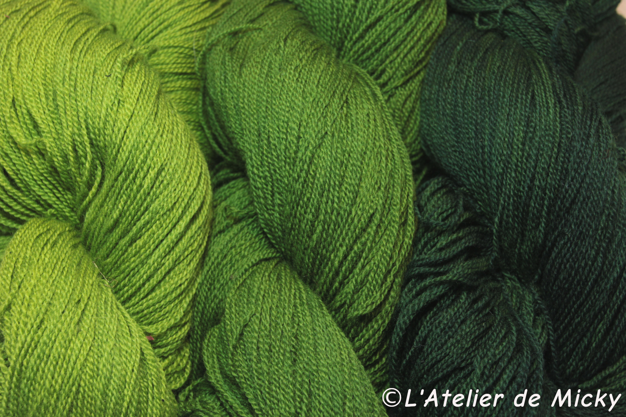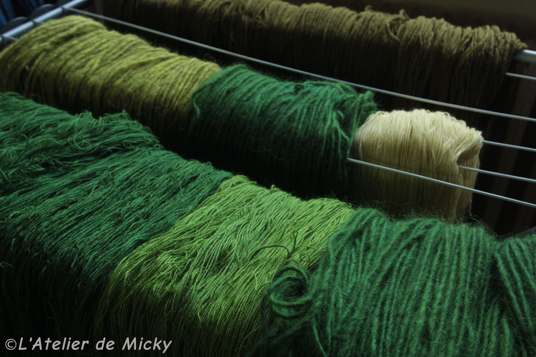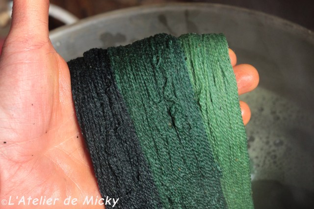 Pour cette laine également, il me manquait des verts, voici 3 écheveaux teintés à l’indigo en fermentation, mordancés puis teintés à la gaude pendant les toutes premières minutes de la naissance des verts…