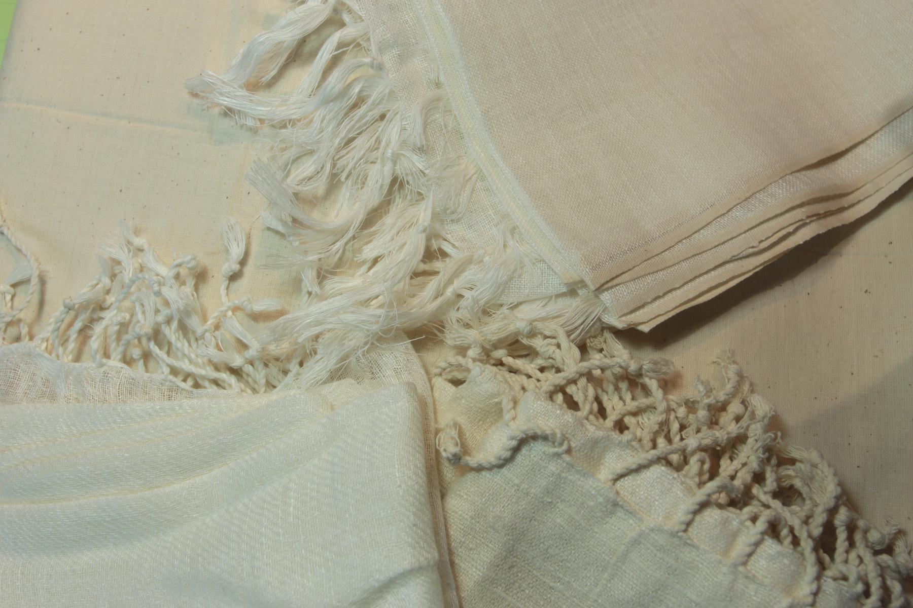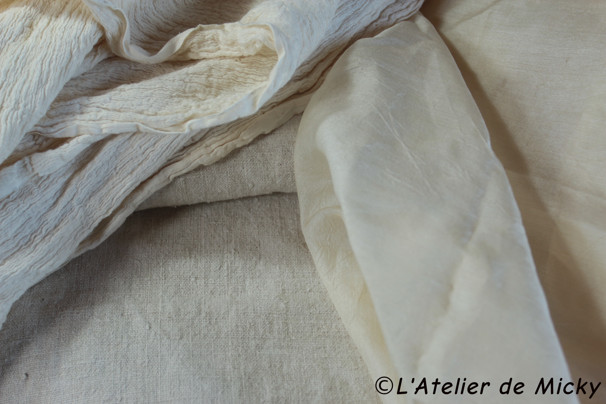 En attendant que ma grosse cuve s’équilibre bien, j’ai préparé des coupons de tissus à y teindre: des écharpes longues en coton bio froissé, du lin ancien tissé main et une magnifique soie Ahimsa (non violente) tissée main également.