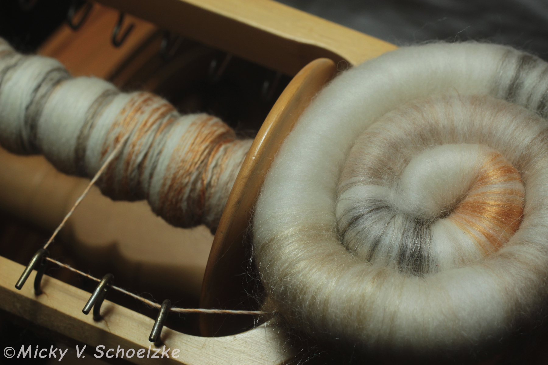 Avec mon ralentissement annuel, je prends à nouveau du temps pour des loisirs textiles personnels, du filage et du tricot en ce moment. Je file de merveilleux rolags de chez Fellview Fibres, dont je vous avais déjà parlé au printemps, mélange de bébé chameau et de diverses soies sauvages aux teintes naturelles magiques! Ca faisait longtemps que je n’avais pas touché à mon rouet et c’est toujours une belle façon de méditer!