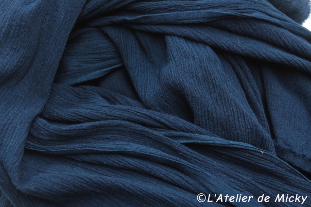 Voici ce que va donner le coton froissé, c’est un chèche que j’ai teinté il y a quelques temps et que je porte régulièrement pour en tester la durabilité (pour le moment, c’est très satisfaisant!)