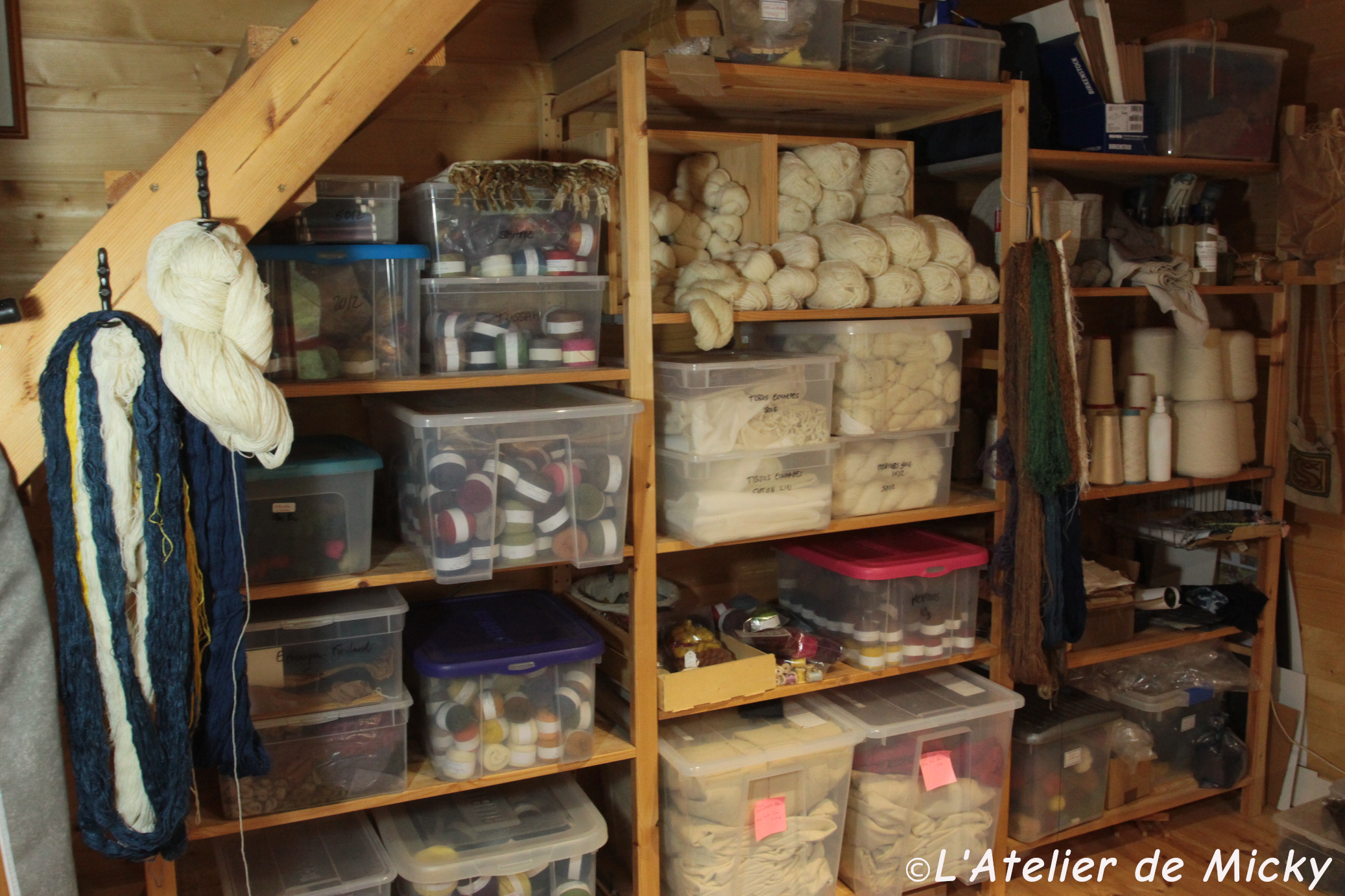 Voici mon petit coin loisir dans l’atelier, avec l’un de mes métiers à tisser et mon rouet, avec vue sur la Nature. Tisser en regardant la neige tomber, c’est dans les petits plaisir qu’on trouve du réconfort!