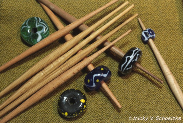 I received some beautiful things from two french craftspersons, that I have to take care of. They are glass whorls (made in a historical glass kiln) by Artisans d’Histoire and spindle sticks by Eric le boiseux. I made marriages between the whorls and the sticks. I love to offer products that I enjoy using myself, these are no exception! I tested every single one…