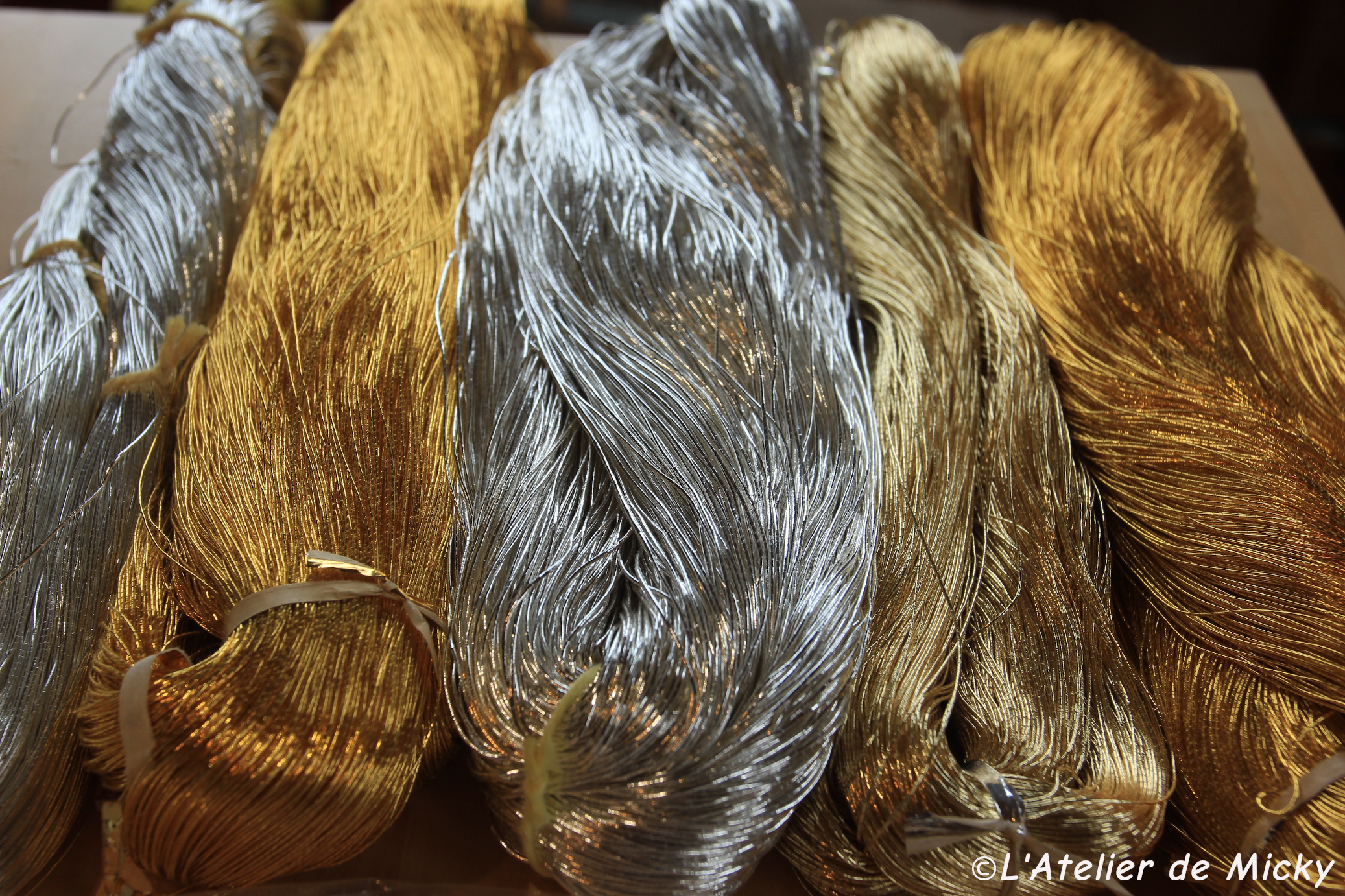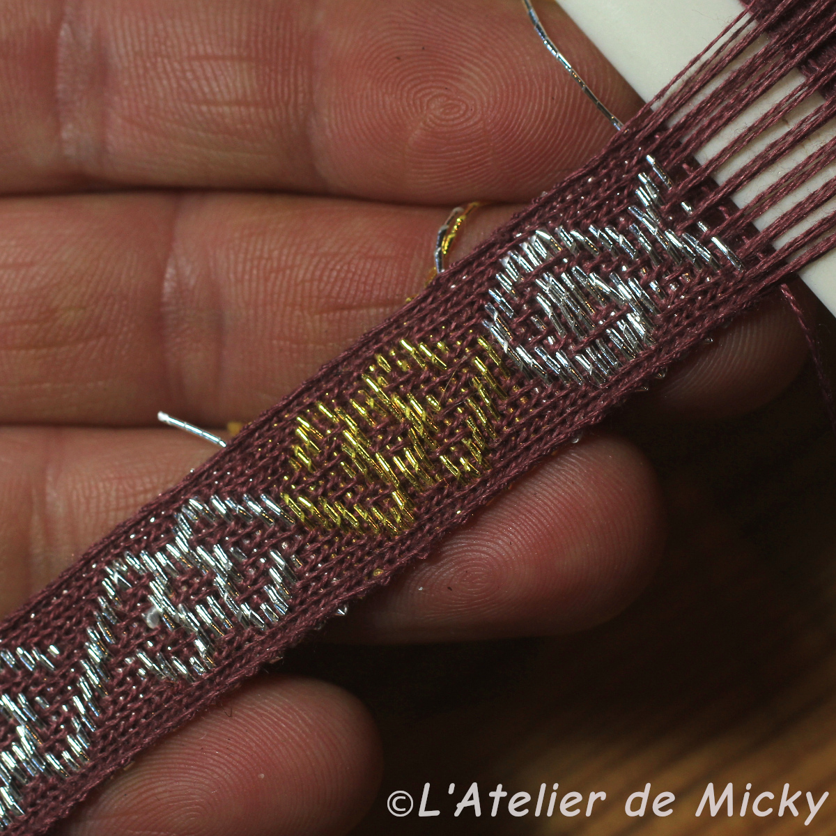 J’ai également testé un fil métallique, du métal filé, qui vient du Japon où il est utilisé principalement en broderie. Même si je le trouve un poil moins souple que certains des fils métalliques que j’ai pu tester et qui sont sur une âme en soie, c’est à dire que la lame de métal est enroulée autour d’un fil de soie (ici, c’est de la rayonne), celui-ci reste très agréable à utiliser en broché. Il a le gros avantage de coûter beaucoup moins cher que les filés métal sur soie qui, de plus, deviennent de plus en plus difficiles à trouver… De quoi s’y essayer à moindre frais avec un résultat visuel satisfaisant!