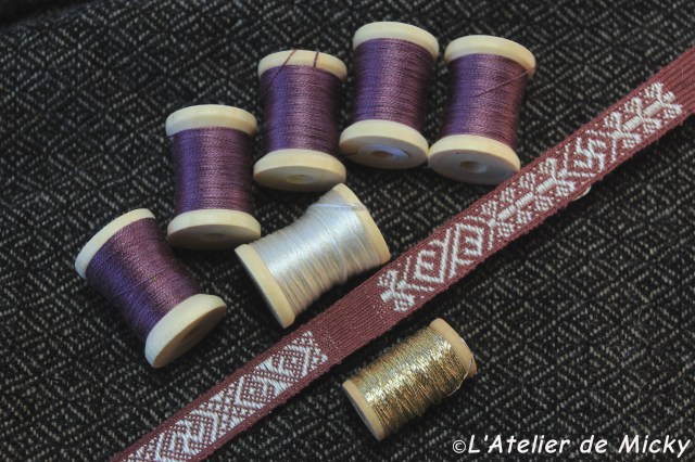 Les originaux de Birka sont en soie et fils métalliques de diverses natures (principalement fils d’argent étiré ou filé), mais pour débuter, la soie ovale est très bien et a l’avantage de très bien ressortir sur l’arrière-plan, ce qui rend les erreurs plus simples à repérer. Ces galons font seulement un peu plus d’un centimètre de large!