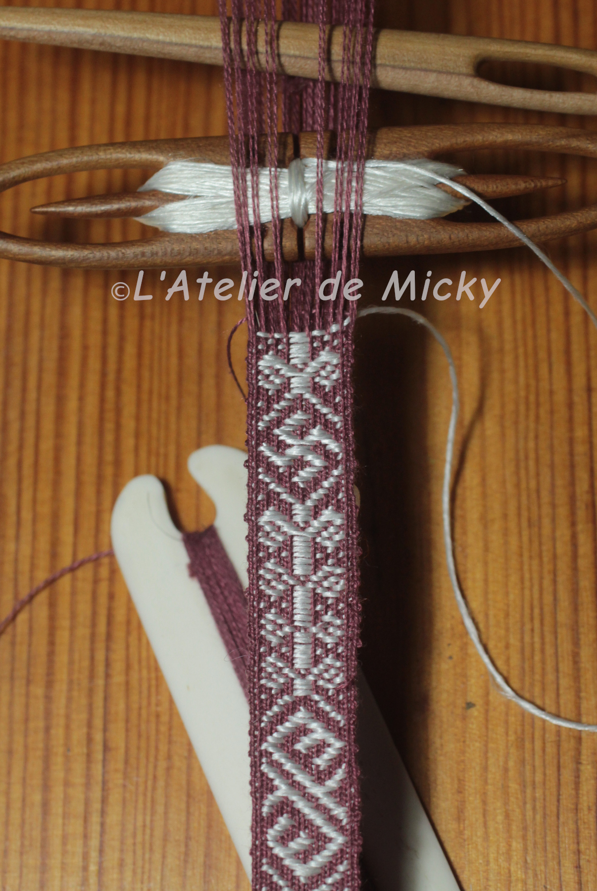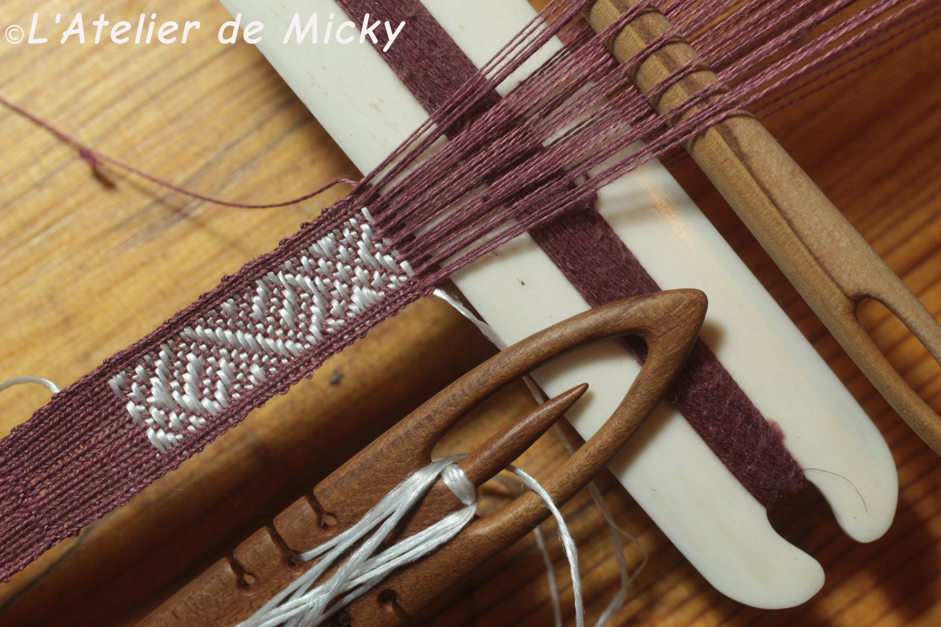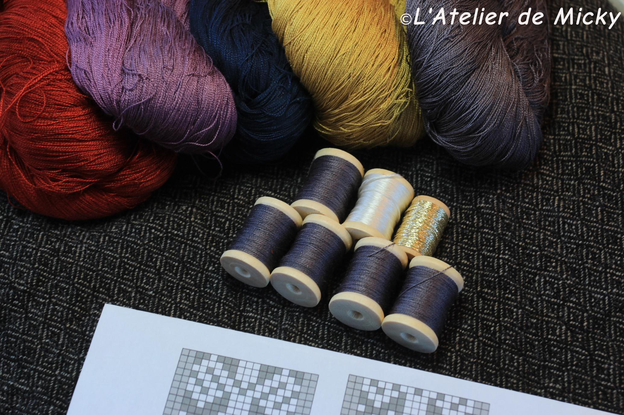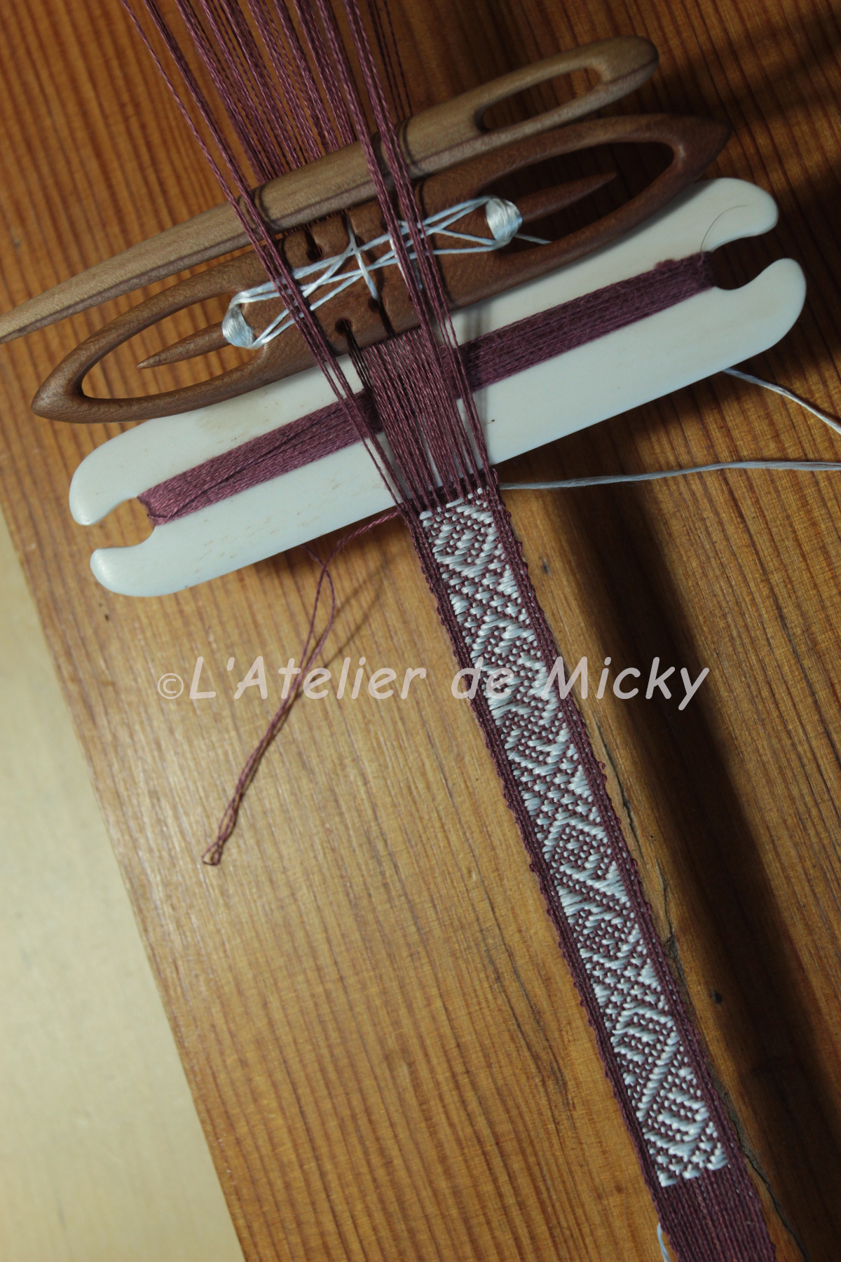 Le broché est une technique assez simple en tissage aux tablettes, mais qui demande patience et minutie et prend davantage de temps. Pour les kits, j’ai choisi des soies 60/2 pour le tissage du fond et de la soie filament pour la trame de broché.