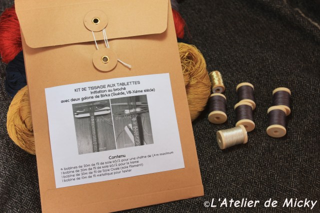 Each kit allows a maximum warp length of 140cm and there’s enough thread for warp, « normal » weft and brocade weft. I also added a bit of spun metal thread to test, in a color (gold or silver) adapted to the background colour. On this length, there’s enough room to train, test and make two small bands. The majority of brocaded Birka bands were apparently use on small areas of the costumes (around the head, between brooches on the chest, on cuffs etc.)