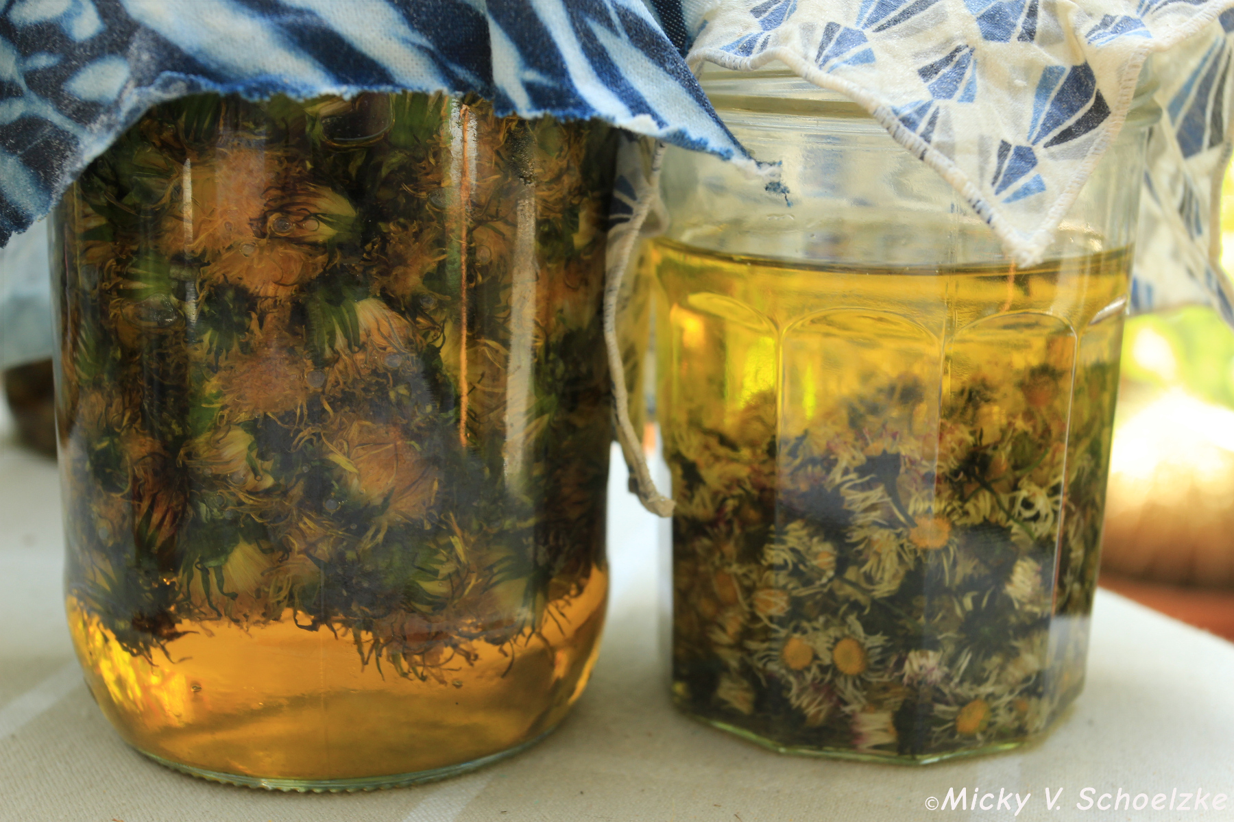 To make an oily maceration is pretty easy, you just have to harvest some flowers when the weather is good and in the middle of the day when they are wide open. Then you let them dry for a few days to remove moisture and put them into glass jars with oil (sesame oil for me) for 4-6 weeks (6 for me). There are of course many other plants you can make oily macerations with, like plantain leaves or comfrey roots, there are many ressources about all that on the web. To be harvested with respect and moderation of course…