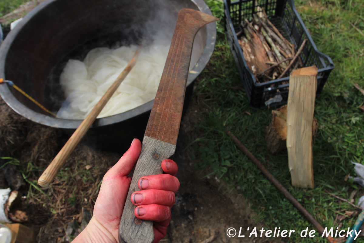Un autre outil est avec moi depuis longtemps, une machette achetée au Burkina Faso à un monsieur qui ne comprenait pas vraiment pourquoi cette étrange « toubab » voulait lui acheter un outil agricole. Je m’en sers pour couper du petit bois en chauffant mes cuves et je crois que ça inquiète un peu mes voisins. Ce jour là pourtant j’avais ajouté une touche féminine avec un joli rose cochenille sur les mains… Gros chaudron qui fume, machette et mains multicolores sur une femme échevelée aux vêtements souvent sales, voilà qui vu de loin doit sembler un peu étrange!