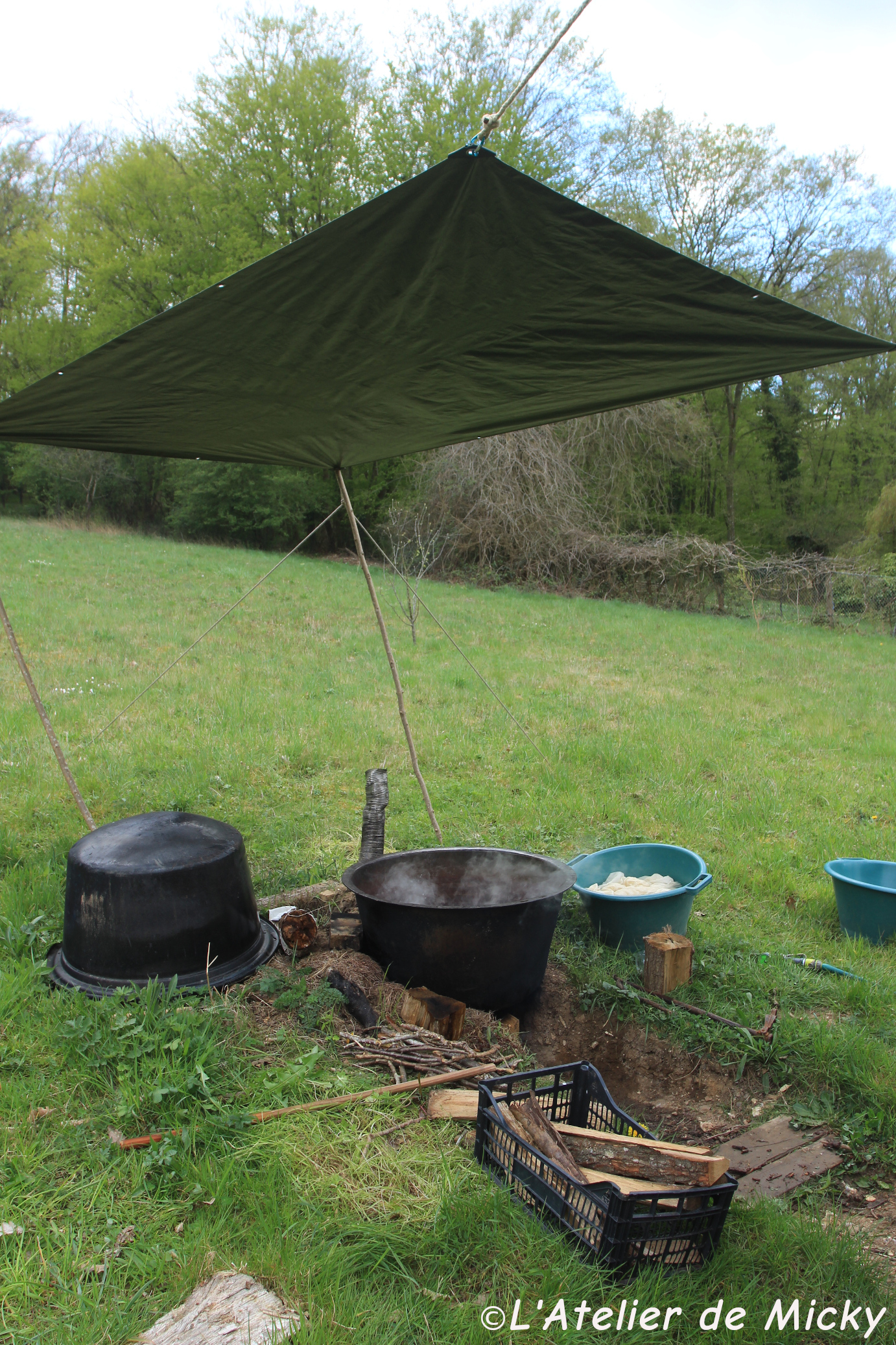 Le printemps, c’est aussi le moment de faire le point sur son matériel et de rénover ou remplacer certaines choses. Ma vieille toile de auvent, qui m’a accompagnée aussi bien en campement que chez moi a finalement rendu l’âme dans un craquement sinistre lors d’une grosse bourrasque de vent… Avant de la remplacer, j’ai donc utilisé une bâche à bois verte, maintenant je vais être presque invisible depuis les airs, me fondant dans la verdure de ma prairie!