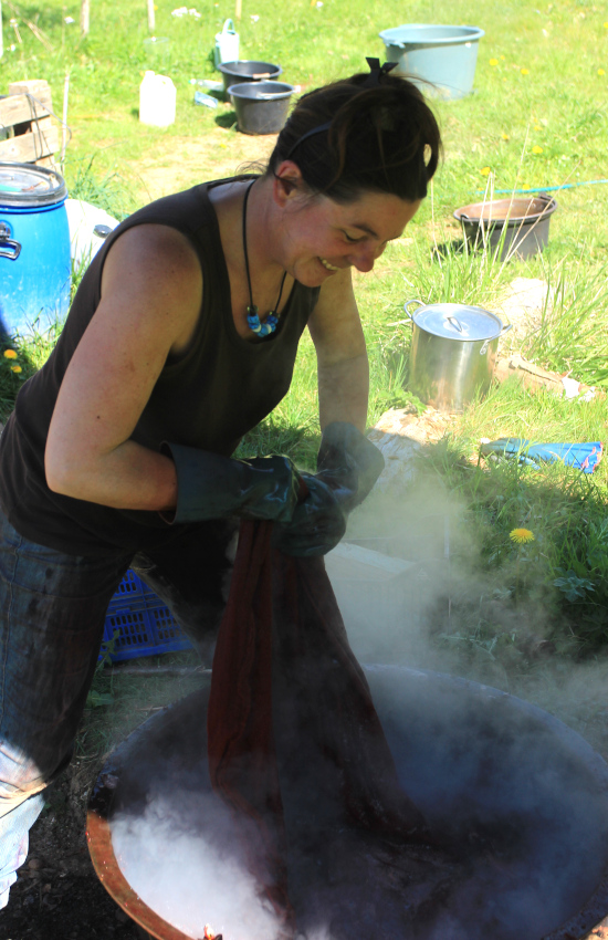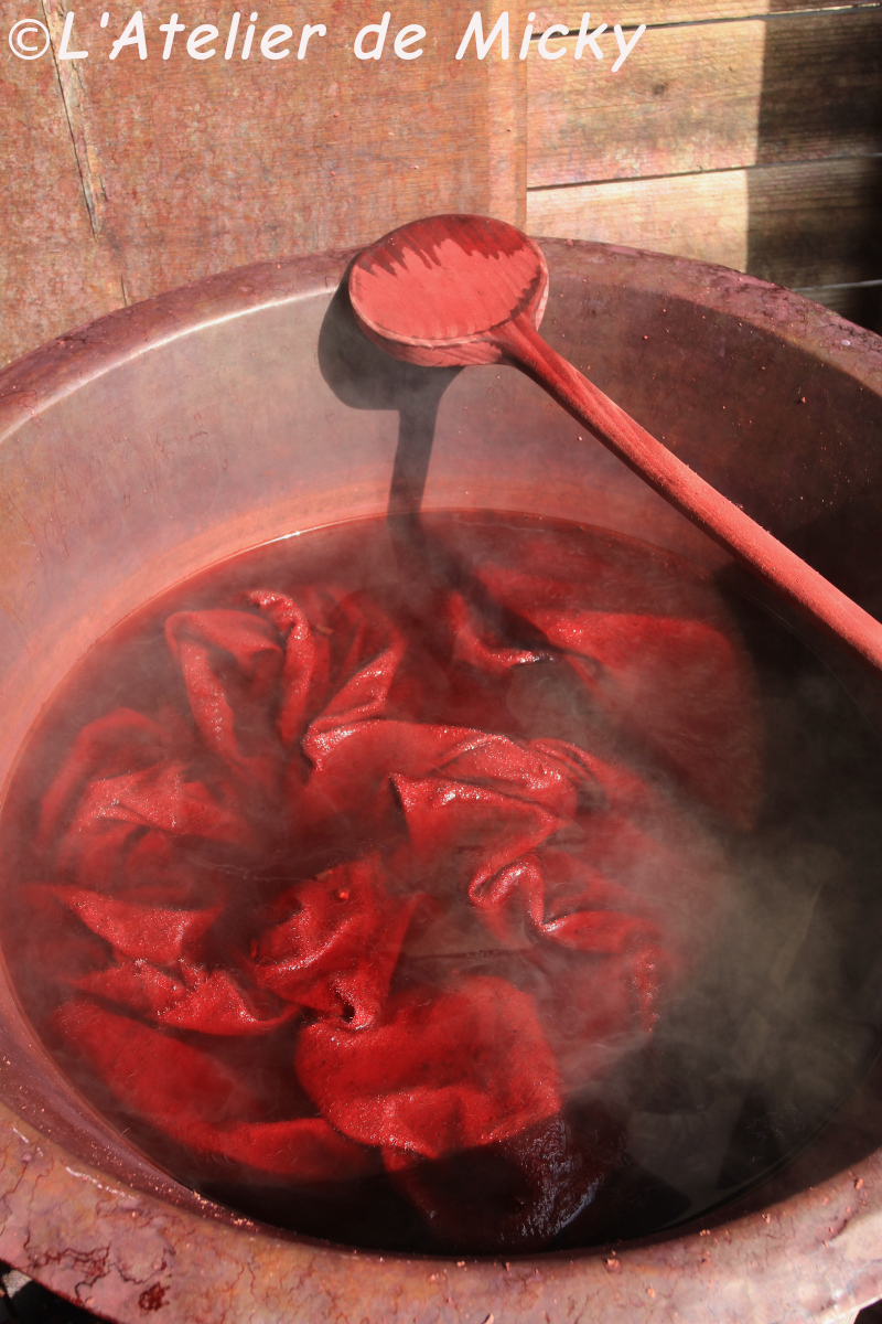 Again, moving the fabric during the whole heating time is ctucial, first by hand, chasing folds and lifting and plunging the fabric, then with a stick. Last year I did a video on madder dye that you can see here. (sorry, comments are all in french…)
