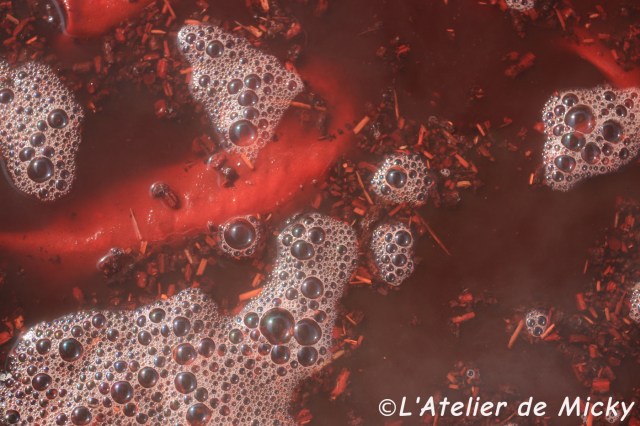 Quand on teinte avec la garance, il est primordial de bien garder les tissus en mouvement pendant toute la montée en température jusqu’à 70-75°C. D’autant plus que je préfère garder les morceaux de racine dans le bain, sans utiliser de nouet. Je trouve que la garance libre dans le bain assure une meilleure extraction des principes tinctoriaux. Et de toute manière, à partir d’un certain poids de racine, un nouet devient plus encombrant qu’autre chose dans le bain je trouve, car il faut le triturer également pour avoir une bonne extraction…