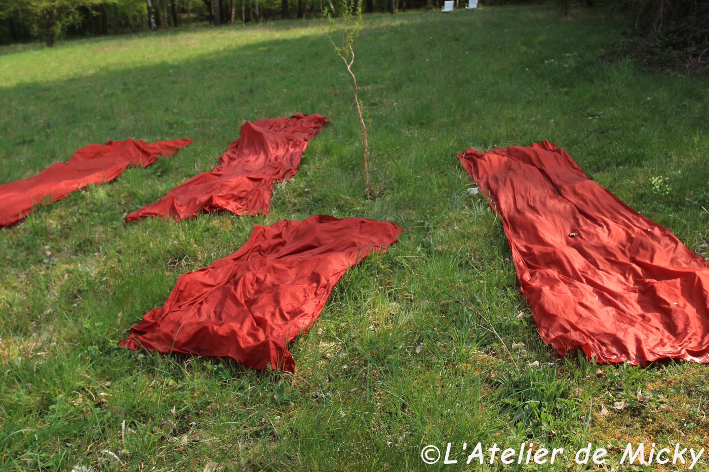 Le problème avec cette méthode, c’est qu’il faut s’assurer que le tissu bouge en permanence, car les morceaux de garance peuvent faire des taches. C’est ce qui m’est arrivé sur le premier lot de soie, tout simplement parce qu’en fin de teinture (qui était jusque là parfaite…), j’avais très très faim et l’hypoglycémie embrumant quelque peu mon cerveau, j’ai laissé le tissu fini dans le chaudron au lieu de le mettre à refroidir gentiment dans un baquet avec le bain… Les braises étaient encore chaudes et se sont ranimées avec le vent, l’épais chaudron en cuivre a encore diffusé de la chaleur… Et paf, les petites taches de garance sont apparues là où les morceaux étaient immobiles sans mon intervention , avec cette petite chauffe supplémentaire… Dans ces cas-là, on se donne une grosse baffe, on jure vraiment beaucoup et on s’y remet. Ne jamais relâcher son attention en teinture, jamais!