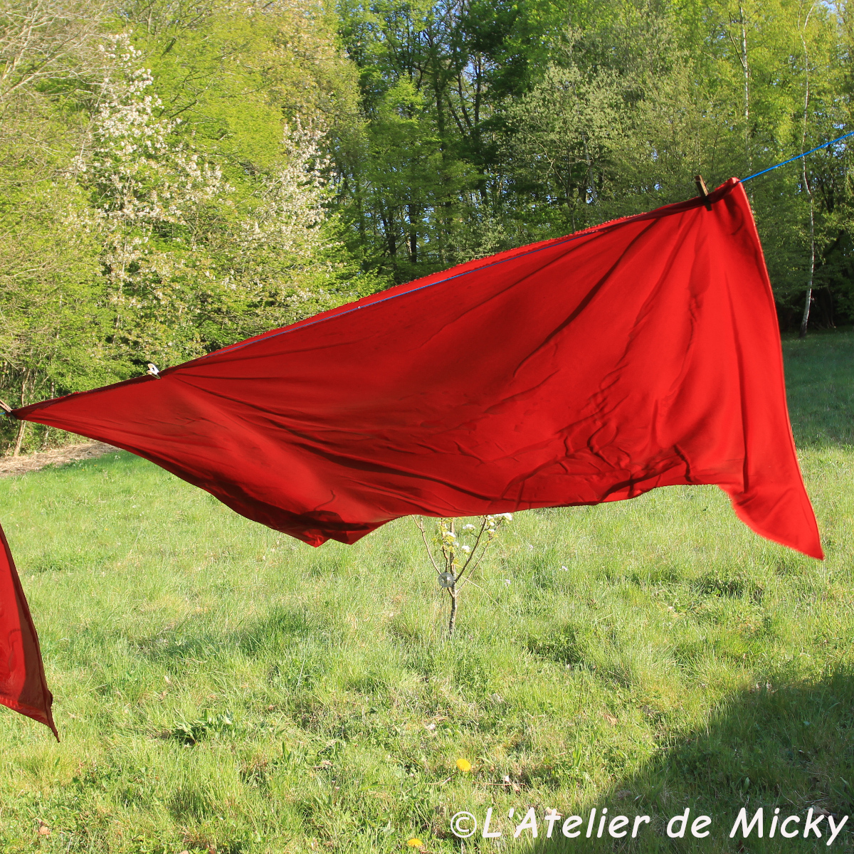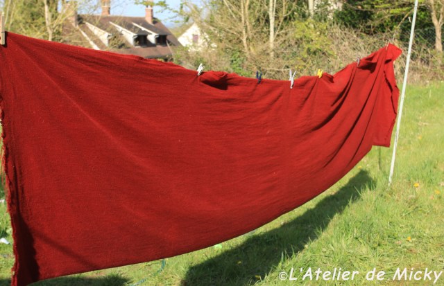 Voici le tissu en train de s’égoutter; il est plié en 2 dans le sens de la longueur ici pour ne pas qu’il traîne par terre en se balancant dans le vent, il est un peu lourd pour ma pauvre corde à linge!