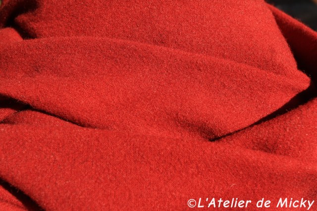 First, a piece of light woollen twill had to be dyed in a kind of « ruby » red, so madder wasn’t the best candidate for that shade, with its tendency towards yellow. Therefore I used a recipe that I adapted a bit, using cochineal and madder. Mordanting was done with alum and cream of tartar and dyeing was performed in a rainwater bath, to respect the cochineal’s preferences. The original recipe, that I had already tested on skeins but never on fabric, requires 14% of cochineal and 10% of madder, but I changed it a little bit.