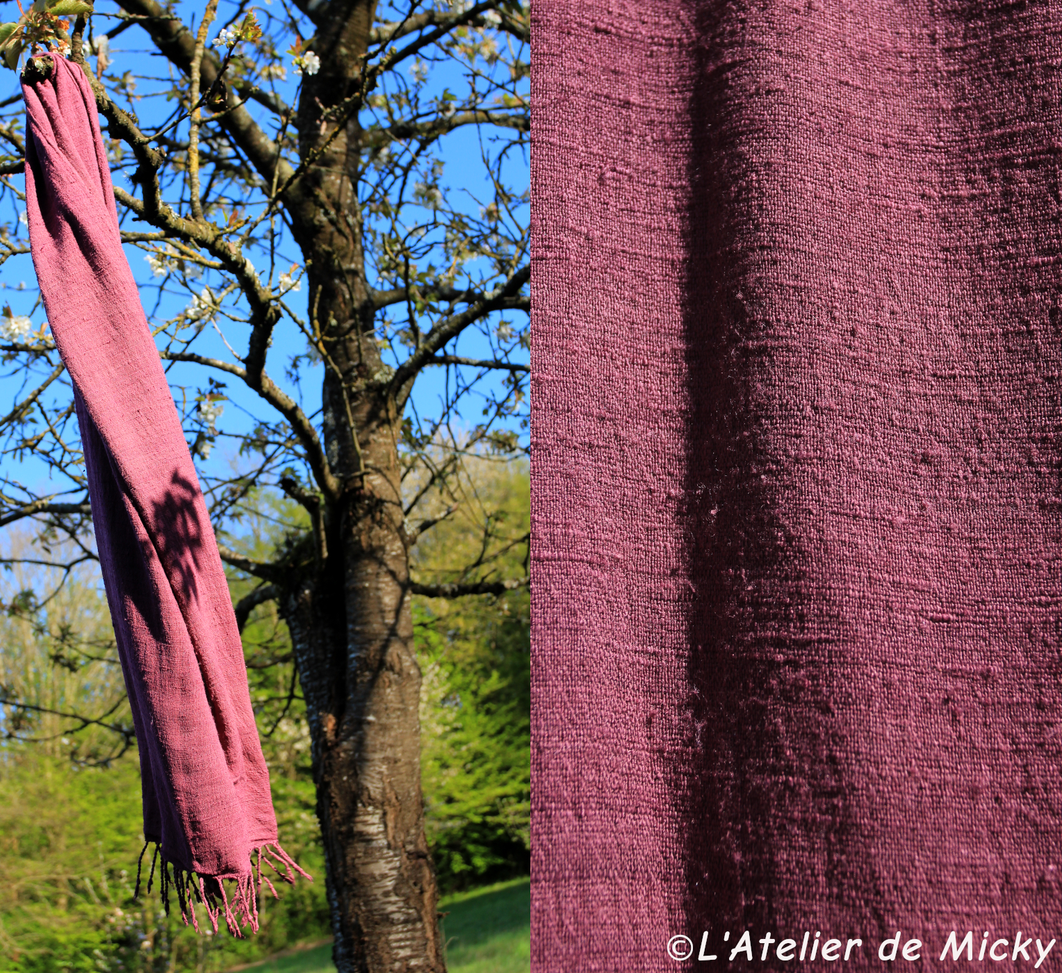 Quand je suis sur des tissus, ils mobilisent mon attention et je ne fais pas de teintures à côté, mais j’ai tout de même pris le temps d’utiliser une partie du bain de cochenille pour teindre une écharpe en soie sauvage indienne (avec nuançage au fer).