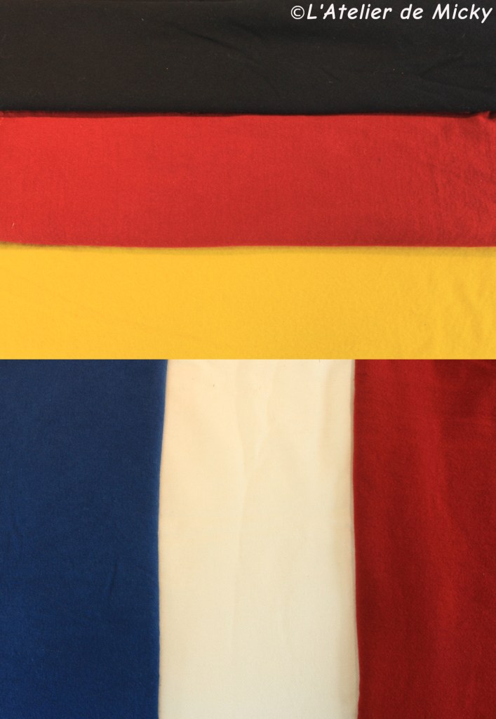 Pendant que je préparais les tissus pour envoi, je me suis amusée à créer les drapeaux de mes deux pays: l’Allemagne mon pays de sang et la France mon pays de sol et d’adoption, c’était trop tentant! Le noir est ce fameux noir flamand en triple teinture que j’avais teinté en 2018.