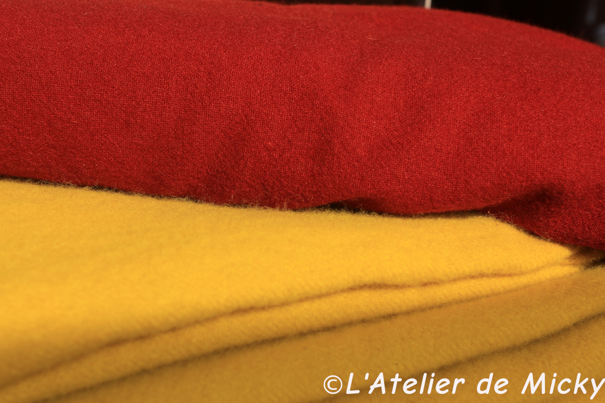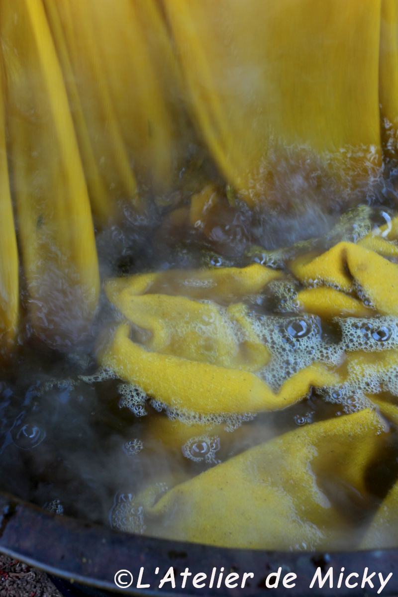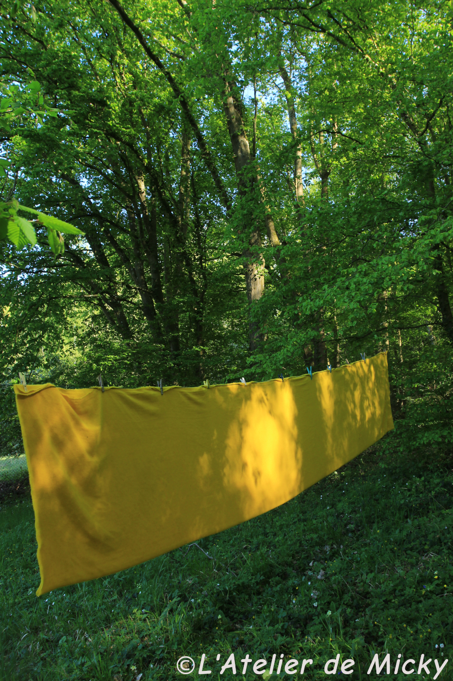 J’avais encore un tissu à teindre en jaune après la vague de rouges! Encore 4m de sergé au grammage moyen à teindre avec de la gaude.
