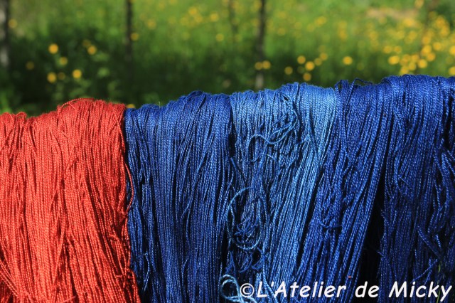Après ça, je suis passée à l’indigo pour des commandes particulières et également pour remplir mon stock. Il me manque aussi quelques verts et des noirs, et je fais généralement les teintures indigo avant mordançage et passage dans un bain de gaude pour les verts ou de garance pour les noirs. Encore pas mal de travail en perspective!