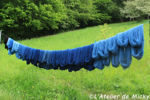 L’image ci-dessous représente une journée de travail de teinture indigo, un peu plus de 5kg de laines en écheveaux. Comme un seul bain ne suffit jamais pour l’indigo, chaque lot passe plusieurs fois dans la cuve pendant quelques minutes. Je teinte généralement par lot de 300g à 1.5kg, selon les nuances identiques dont j’ai besoin. Particulièrement quand on veut sur-teinter les bleus, leur profondeur doit être assez finement dosée pour pouvoir obtenir ensuite les verts et noirs qu’on désire obtenir. cela demande un peu d’organisation et une liste précise! Et un peu de muscles…