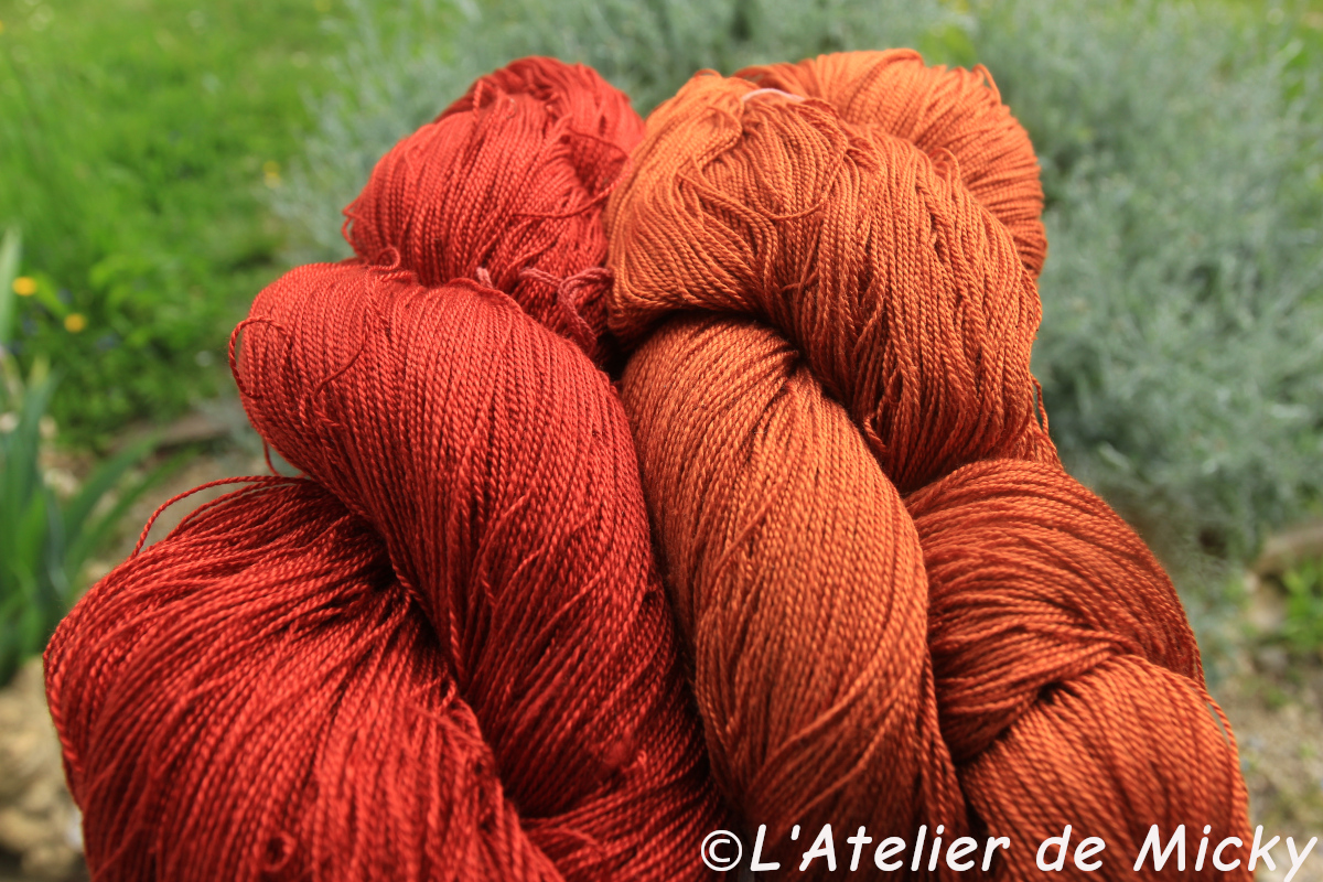 En parlant de soie teintée, celle-ci demande souvent des procédure différentes de la laine (comme le coton ou le lin d’ailleurs, procédures encore plus différentes!). Ci-dessous vous avez un exemple de deux soies 20/2 identiques, teintées avec la même concentration de racines de garance dosées à 200% (pour du rouge soutenu sur la soie, il faut sur-doser). L’écheveau bien rouge de gauche a été mordancé à l’alun seul (20%) alors que l’écheveau orangé de droite a été mordancé à l’alun (20%) et à la crème de tartre (6%). Je vois parfois passer des recettes où l’emploi de crème de tartre est systématique pour laine et soie, mais vous voyez qu’on peut passer à côté de certaines nuances en appliquant des recettes toutes faites… Ça vaut vraiment le coup de jouer avec les différents mordançages pour voir les différences parfois spectaculaires qu’ils peuvent engendrer et qui dépendent également de la qualité et des propriétés de l’eau que vous utilisez. Le mordançage est une étape cruciale de la teinture, dans laquelle beaucoup de choses se jouent et je pense que chaque teinturier doit sans doute trouver les recettes qui lui seront propres.